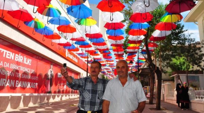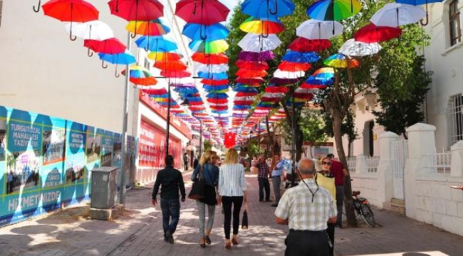 Manisa'da 103 metrelik şemsiyeli sokak Ersan ERDOĞAN/ MANİSA, MANİSA'nın Şehzadeler Belediyesi, bir sokağı 650 şemsiyeyle 103 metrelik şemsiyeli sokağa çevirdi. Şehzadeler Belediyesi, 1'inci Anafartalar Mahallesi'ndeki 1603 Sokak'ı, 650 şemsiye kullanarak 103 metreyi şemsiyeli sokağa dönüştürdü. Üzerini örten şemsiyelerle renklenen ve ülkenin 'en büyük' şemsiyeli sokağı olduğu belirtilen sokak yeni yüzüyle vatandaşların ilgi odağı oldu. Sokakta yapılan çevre düzenlemesiyle, önceden pek kullanılmayan sokağa rağbet artı. Kısa bir süre önce hizmete giren sokakta, fotoğraf çekilmek isteyen vatandaşlar şimdiden birbirileriyle yarışmaya başladı. ESNAFTAN TEŞEKKÜRSokak üzerinde bulunan bir kafenin işletmecisi Erman Akyüz, "Daha bir ay öncesine kadar insanların geçmediği sokağımız, Şehzadeler Belediye Başkanı Ömer Faruk Çelik'in girişimiyle güzel bir sokak haline geldi. Belediyemize teşekkür ediyoruz. Buradaki esnaf için de büyük bir olanak ve büyük bir güzellik oldu. İnsanlar artık buraya fotoğraf çekmeye, evlenecek olanlar düğün fotoğraflarını çektirmeye geliyorlar. Tüm Manisa için hayırlı bir iş oldu. Belediye başkanlarımıza bu hizmetleri için teşekkür ederiz" diye konuştu. dha