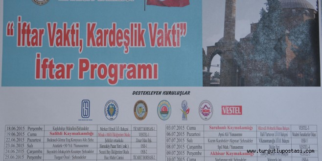 Ramazan ayında Manisa Valiliği İl Sosyal Etüt ve Proje Müdürlüğü koordinesinde hazırlanan 'İftar Vakti Kardeşlik Vakti' projesi çerçevesinde hayırseverlerin katkılarıyla Manisa merkez ve 6 ilçesinde yaklaşık 20 bin kişiye iftar verilecek.Proje ile, Manisa’nın yoğun göç alan mahallelerinde yaşayan vatandaşlarla birlikte iftar yapılarak devlet-vatandaş kaynaşmasının sağlanması, birlik, beraberlik, kardeşlik ve yardımlaşma duygularının canlandırılarak farkındalığın artırılması amaçlanıyor.Vali Erdoğan Bektaş ve ilgili daire müdürlerinin katılımıyla 21 gün boyunca Manisa merkezdeki 15 mahalle ile Salihli, Turgutlu, Saruhanlı, Akhisar, Alaşehir ve Soma ilçelerinde 5 ayrı menüden oluşan yaklaşık 19 bin 350 kişiye verilecek iftar yemeklerinde vatandaşların dertleri dinlenerek çözüm de bulunmaya çalışılacak.“İftar Vakti Kardeşlik Vakti” Projesinin ilk iftarı, 18 Haziran Perşembe günü Kuşlubahçe Mahallesinde Merkez Efendi İlköğretim Okulu bahçesinde Ticaret Borsası sponsorluğunda gerçekleştirilecek. 22 Haziran Pazartesi günü Şehzadeler Ziraat Odası sponsorluğunda Şehitler Ortaokulu bahçesinde bedensel engelliler, görme engelliler, koruyucu aileler birlikte iftar yapacaklar. 2 Temmuz Perşembe günü Manisa Organize Sanayi Bölgesi (MOSB) sponsorluğunda MOSB bahçesinde şehit yakınları ve gaziler ile iftar yapılacak. Program 16 Temmuz Perşembe günü Sanayi ve Ticaret Odası sponsorluğunda Alaybey Mahallesindeki Cumartesi Pazar yerinde verilecek iftar yemeği ile sona erecek. Projeye Destek Veren Kurum ve Kuruluşlar: Manisa Valiliği (İl Sosyal Etüt ve Proje Müdürlüğü, Sosyal Yardımlaşma ve Dayanışma Vakfı Müdürlüğü), Şehzadeler Kaymakamlığı, Yunusemre Kaymakamlığı, Akhisar Kaymakamlığı, Alaşehir Kaymakamlığı, Salihli Kaymakamlığı, Saruhanlı Kaymakamlığı, Soma Kaymakamlığı, Turgutlu KaymakamlığıSponsorlar: Manisa Organize Sanayi Bölgesi, Manisa Ticaret ve Sanayi Odası, Manisa Ticaret Borsası, Şehzadeler Ziraat Odası, Manisa Esnaf ve Sanatkârlar Odaları Birliği, Manisa Madeni Sanatkârlar Esnaf Odası, Vestel Elektronik Üretim Sanayi AŞ., Sadık ÖZKASAP ve Ergun TÜREK