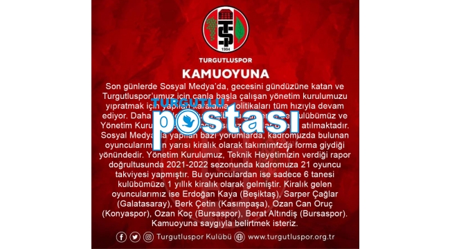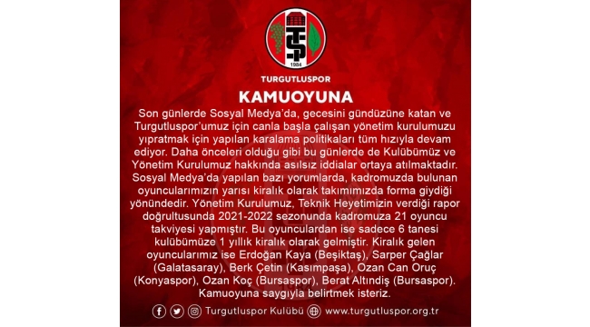 21 takviye futbolcudan 6 tanesi bir yıllık kiralıktırTurgutluspor yönetim kurulu yaptığı yazılı açıklamada ” kulübe ,21 oyuncu takviyesi yapmıştır. Bu oyunculardan ise sadece 6 tanesi kulübümüze 1 yıllık kiralık olarak gelmiştir. Değerli taraftarlarımıza ve kamuoyuna saygıyla duyurulur!” ifadelerine yer verdi.Açıklama şu şekilde : “Son günlerde sosyal Medya’da, gecesini gündüzüne katan ve Turgutluspor’umuz için canla başla çalışan yönetim kurulumuzu yıpratmak için yapılan karalama politikaları tüm hızıyla devam ediyor. Daha önceleri olduğu gibi bu günlerde de Kulübümüz ve Yönetim Kurulumuz hakkında asılsız iddialar ortaya atılmaktadır. Sosyal Medya’da yapılan bazı yorumlarda, kadromuzda bulunan oyuncularımızın yarısı kiralık olarak takımımızda forma giydiği yönündedir. Yönetim Kurulumuz, Teknik Heyetimizin verdiği rapor doğrultusunda 2021-2022 sezonunda kadromuza 21 oyuncu takviyesi yapmıştır. Bu oyunculardan ise sadece 6 tanesi kulübümüze 1 yıllık kiralık olarak gelmiştir. Kiralık gelen oyuncularımız ise Erdoğan Kaya (Beşiktaş), Sarper Çağlar (Galatasaray), Berk Çetin (Kasımpaşa), Ozan Can Oruç (Konyaspor), Ozan Koç (Bursaspor), Berat Altındiş (Bursaspor). Kamuoyuna saygıyla belirtmek isteriz. DOĞAN ÇİZMECİ