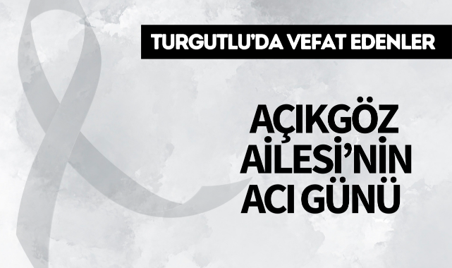 Açıkgöz Ailesi’nin Acı GünüTURGUTLU İlçesi sakinlerinden Rıza Açıkgöz'ün eşi Hanife Açıkgöz (70) hakkın rahmetine kavuştu. Cenazesi bugün öğle namazına müteakip Pazar Camii’nde kılınacak cenaze namazının ardından yeni kabristanda toprağa verilecek.Yakınları: eşi Rıza Açıkgöz, damadı Mustafa Kutlu, kardeşleri merhum Ali Çetin, Emine Filiz, Bekir KırdaşMerhumeye Allah'tan rahmet, yakınlarına başsağlığı dileriz.