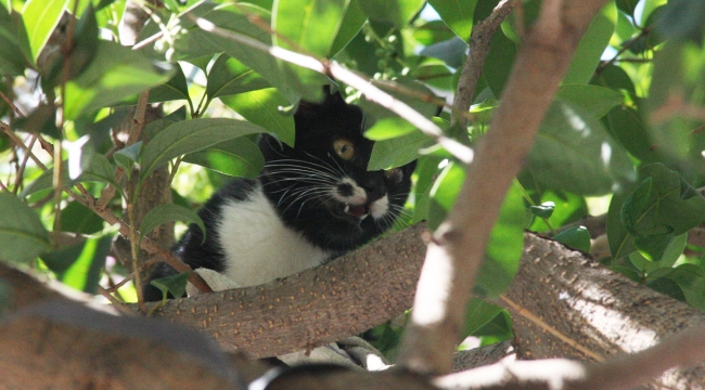 Ağaçta mahsur kalan kediyi itfaiye kurtardıDoğan ÇİZMECİ/ TURGUTLU(Manisa),(DHA)- MANİSA'nın Turgutlu İlçesi'nde, çıktığı ağaçtan inemeyerek 2 gün mahsur kalan kedi itfaiye ekipleri tarafından kurtarıldı.Bu sabah Turgutlu İtfailesi'ni arayan bir kişi, İstiklal Mahallesi, Şehitler Yolu üzerindeki bir ağaçta 2 günden bu yana mahsur kalan bir sokak kedisi olduğunu bildirdi. Merdivenli araçla sevk edimlen itfaiye görevlilerinden ürken kedi, daha da yukarı dallara kaçtı. İtfaiye erine zor anlar yaşatan kedi, güçlükle de olsa yakalandı. Ağaçtan indirilen kedi, itfaiye erinin elinden atlayıp, hızla kaçarak gözden kayboldu. Kedinin tekrar özgürlüğüne kavuşması çevredekileri sevindirdi. Sokak sakinleri, kediyi kurtaran itfaiye ekibine teşekkür etti.