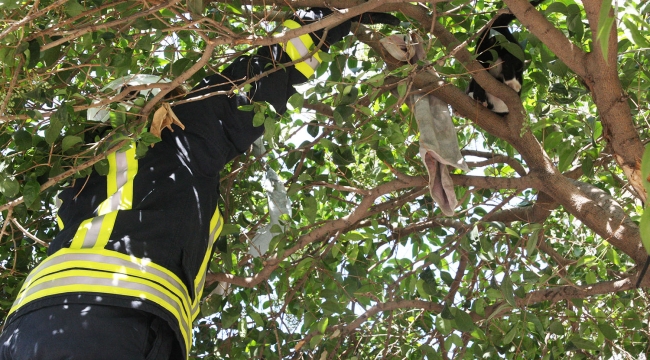 Ağaçta mahsur kalan kediyi itfaiye kurtardı