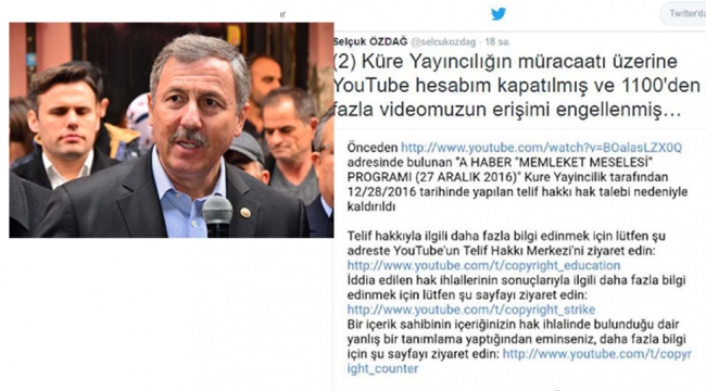 AK Partili Özdağ'ın videolarına engelAK Parti Manisa Milletvekili ve FETÖ Darbe Girişimi Meclis Araştırma Komisyonu Başkanvekili Selçuk Özdağ, FETÖ'yle ilişkili olduğu gerekçesiyle kapatılan Küre Yayıncılık'ın Kaliforniya merkezli ABD şirketi olan Youtube'a başvurusu üzerine, sitedeki yaklaşık 1500 videosunun engellendiğini açıkladı. Yazılı açıklama yapan AK Parti Manisa Milletvekili ve FETÖ Darbe Girişimi Meclis Araştırma Komisyonu Başkanvekili Selçuk Özdağ, Youtube video sitesi üzerindeki değişik kanal ve programlarda yer alan 1500 videodan oluşan görüntülerinin engellendiğini duyurdu. Özdağ, "Hain terör örgütü FETÖ'ye rahatsızlık vermeye devam ediyoruz. Konuk olduğum TV programlarının paylaştığım görüntüleri, FETÖ'nün şirketinin başvurusu sonucu, telif hakkı bahanesiyle kapatılmış olmakla beraber, bu videolara erişim engeli koyan Youtube FETÖ'nün tezgahına gelmiş ve bu kirli oyuna alet olmuştur" dedi.İnternette sansür furyasının başlatıldığını ve hukuksuzluk yapıldığını savunan Özdağ, "15 Temmuz darbe girişiminden sonra 1 Eylül'de çıkan kanun hükmünde kararname neticesinde FETÖ'nün şirketi olduğu saptanan ve kapatılan Küre Yayıncılık'ın tüm hakları ise kapatıldığından dolayı feshedilmiştir. Buna rağmen telif hakkı bahanesiyle Fethullah Gülen ve örgütüne yönelik yaptığımız açıklamaların yer aldığı tüm videolarının erişiminin engellendiğini gördük. Bu bir hukuksuzluktur. Telife gerekçe olarak ise örgüt elebaşı Gülen'e ait görüntülerin kullanılması gösteriliyor. FETÖ'cü Küre Yayıncılık'ın hiçbir hukuki dayanağı bulunmamasına rağmen 'telif hakkı' gerekçesiyle yüzlerce videoyu kaldırma başvurusunu, Kaliforniya merkezli ABD şirketi olan Youtube'un olumlu bularak görüntülere sansür uygulaması büyük bir skandal olarak kayıtlara geçmiş durumda" dedi. DHA