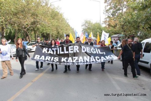 Manisa'da, Ankara'daki bombalı saldırı kınandı MANİSA'da düzenlenen eylem ve yürüyüşle, Ankara'da meydana gelen bombalı terör eylemi kınandı.İlk eylem Manisa Tabip Odası ile Sağlık Emekçileri Sendikası (SES) Manisa Şubesi'nce, Moris Şinasi Çocuk Hastanesi'nin Acil Servisi'nin önünde düzenlendi. Servis önünde toplanan yaklaşık 100 kişilik doktor ve sağlık çalışanı, açtıkları siyah pankartla patlamada ölenler için bir dakikalık saygı duruşunda bulundu.Ardından grup adına açıklama yapan Manisa Tabip Odası Başkanı Derya Pekbayık, "Patlama anında biz de ordaydık. Patlamayı yakından gördük. Patlamanın şokunu atlatmadan 'Doktor Yok mu? diye bağrışmalar oldu. Yaralananlara bakmaya başladık. Ancak yaralılara müdahale ederken, polisin biber gazına maruz kaldık. Bu nasıl iştir anlayamıyoruz. Ankara'da yaşanan patlamanın sorumluları bellidir. İşte onlara da hesapları sorulmalıdır. 10 Ekim'i asla unutmayacağız" diye konuştu.500 KİŞİLİK YÜRÜYÜŞKentte ayrıca Manisa Lisesi önünden başlayan yürüyüş düzenlendi. DİSK, KESK, TMMOB ve TTB üyelerinin yanı sıra CHP Manisa Milletvekili Tur Yıldız Biçer'in de katıldığı 500 kişilik yürüyüşte; 'Faşizme karşı omuz omuza', 'Gün gelecek devran dönecek AKP halka hesap verecek' sloganları atıldı. Manolya Meydanı'nda son bulan yürüyüşün ardından bir kez daha ölenler için saygı duruşunda bulunuldu.Topluluk adına açıklamayı yapan Eğitim-Sen Manisa Şube Başkanı Metin Demirel, "Bütün vahşetinize, bütün şiddetinize, bütün katliamlarınıza rağmen eşit, özgür, demokratik bir ülkede bir arada yaşamı ve barışı savunmaktan asla vazgeçmeyeceğiz. Bizi korkutmaya, yıldırmaya, yıldırmaya ve sindirmeye çalışanlara sesleniyoruz. Ne kadar saldırırsanız saldırın, korkmayacağız. Yılmayacağız, unutmayacağız ve asla affetmeyeceğiz" dedi.Açıklama sonrası bir süre daha slogan atan grup, sessizce dağıldı. dha