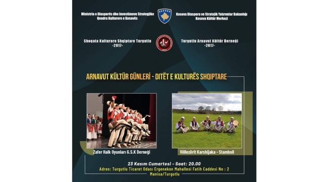 Arnavut Kültür Günlerine davetTURGUTLU İlçesinde, Kosova Diaspora ve Stratejik Yatırımlar Bakanlığı Kosova Kültür Merkezi ile Turgutlu Arnavut Kültür Derneği işbirliğinde cumartesi günü Arnavut Kültür Günleri gerçekleştirilecek.Turgutlu Ticaret ve Sanayi Odasında saat 20.00’da başlayacak Arnavut Kültür Günlerinde Zafer Halk Oyunları G.S.K. Derneği ve Vellezerit Karshijaka – Stamboll ekipleri sahne alacak.Turgutlu Arnavut Kültür Derneği yönetimi, Arnavut Kültür Günlerine Turgutlulu vatandaşları davet etti.