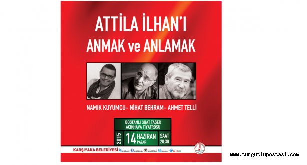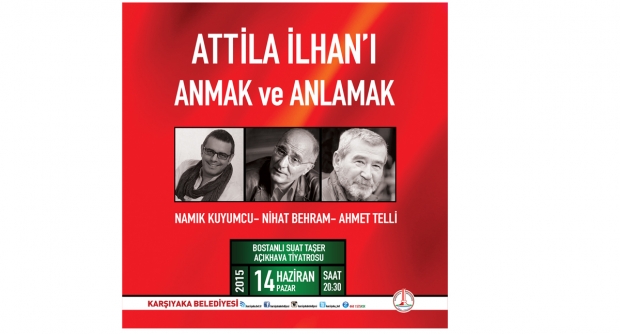 ANMA GECESİKarşıyakalı usta şair, 14 Haziran Pazar akşamı da ‘Attila İlhan’ı Anmak ve Anlamak’ başlıklı bir etkinlikle anılacak. Karşıyaka Belediyesi tarafından düzenlenen gece; sanatçılar Namık Kuyumcu, Nihat Behram ve Ahmet Telli’nin katılımıyla gerçekleşecek. Bostanlı Suat Taşer Açıkhava Tiyatrosu’ndaki ücretsiz etkinlik, saat 20.30’da başlayacak. “HERKESİ BEKLİYORUZ”