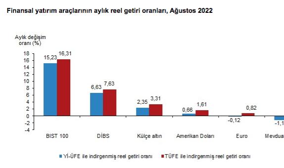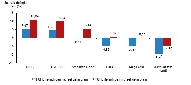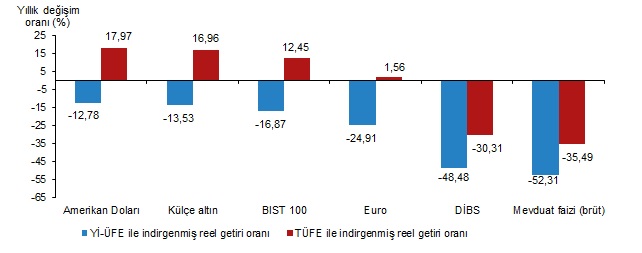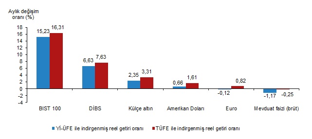 TÜİK' in yayınladığı basın bülteninde şunlara yer verdi : "Yİ-ÜFE ile indirgendiğinde; yatırım araçlarından Devlet İç Borçlanma Senetleri (DİBS) %6,63, külçe altın %2,35, Amerikan Doları %0,66 oranlarında yatırımcısına reel getiri sağlarken, Euro %0,12 ve mevduat faizi (brüt) %1,17 oranlarında yatırımcısına kaybettirdi. TÜFE ile indirgendiğinde DİBS %7,63, külçe altın %3,31, Amerikan Doları %1,61 ve Euro %0,82 oranlarında yatırımcısına reel getiri sağlarken, mevduat faizi (brüt) %0,25 oranında yatırımcısına kaybettirdi.
