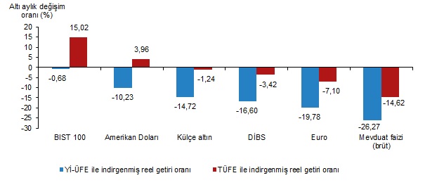 Altı aylık değerlendirmeye göre BIST 100 endeksi; TÜFE ile indirgendiğinde %15,02 oranında yatırımcısına en yüksek reel getiri sağlayan yatırım aracı olurken; Yİ-ÜFE ile indirgendiğinde ise %0,68 oranında yatırımcısına kaybettirdi. Aynı dönemde mevduat faizi (brüt), Yİ-ÜFE ile indirgendiğinde %26,27, TÜFE ile indirgendiğinde ise %14,62 oranında yatırımcısına en çok kaybettiren yatırım aracı oldu.