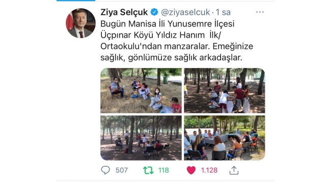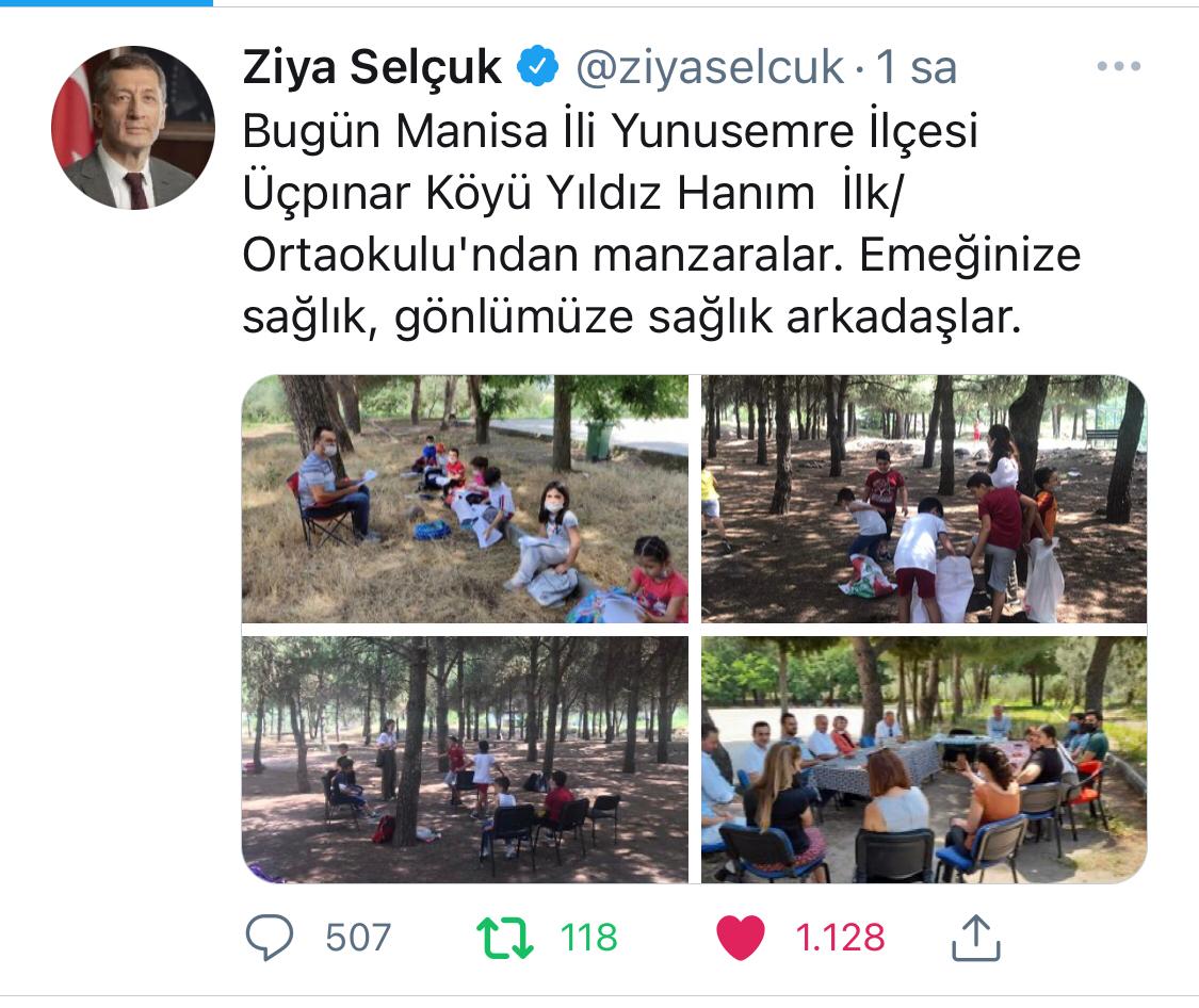 Bakan Selçuk Manisalı öğretmenler ile görüştüMilli Eğitim Bakanı danışmanı Erkan Angın Yunusemre Üçpınar Yıldız Hanım ilkokulu’nda yapılan eğitim faaliyetlerini yerinde inceledi. Erkan Angın Manisa’nın Yunusemre ilçesinde yapılan faaliyetleri Milli Eğitim Bakanı Ziya Selçuk’a aktardı. İnceleme esnasında Milli Eğitim Bakanı Ziya Selçuk öğretmenler için Milli Eğitim Müdürü ile görüntülü telefon görüşmesi yaparak Öğretmenlere başarılar diledi.Bakan Selçuk Twitter hesabından fotoğrafı paylaştı.Milli Eğitim Bakanı Ziya Selçuk Yunusemre Üçpınar Yıldız Hanım ilkokulu bahçesinde çekilen öğretmen ve idarecilerin fotoğrafını twitter hesabında paylaştı.Bakan Selçuk şöyle dedi;“Bugün Manisa İli Yunusemre İlçesi Üçpınar Köyü Yıldız Hanım İlk/Ortaokulu'ndan manzaralar. Emeğinize sağlık, gönlümüze sağlık arkadaşlar.”Manisa İli Yunusemre İlçesi Üçpınar Köyü Yıldız Hanım İlk/Ortaokulu öğretmenleri ise Milli Eğitim Bakanı Ziya Selçuk’un sosyal medyadan paylaştığı fotoğraftan dolayı memnun olduklarını ifade edildi.