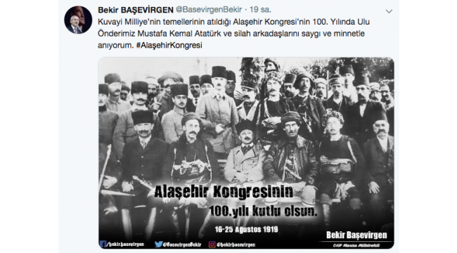 Başevirgen, Alaşehir Kongresinin 100'üncü yılını kutladıCHP Manisa Milletvekili Bekir Başevirgen, 16-25 Ağustos 1919 tarihleri arasında yapılan Alaşehir Kongresinin 100.yılı dolayısıyla bir mesaj yayınladı. Milletvekili Başevirgen, sosyal medya hesabında yaptığı paylaşımda şu görüşlere yer verdi: "Kuvayi Milliye'nin temellerinin atıldığı Alaşehir Kongresinin 100'üncü yılında Ulu Önderimiz Mustafa Kemal Atatürk ve silah arkadaşlarını saygı ve minnetle anıyorum. Alaşehir Kongresinin 100.Yılı kutlu olsun."