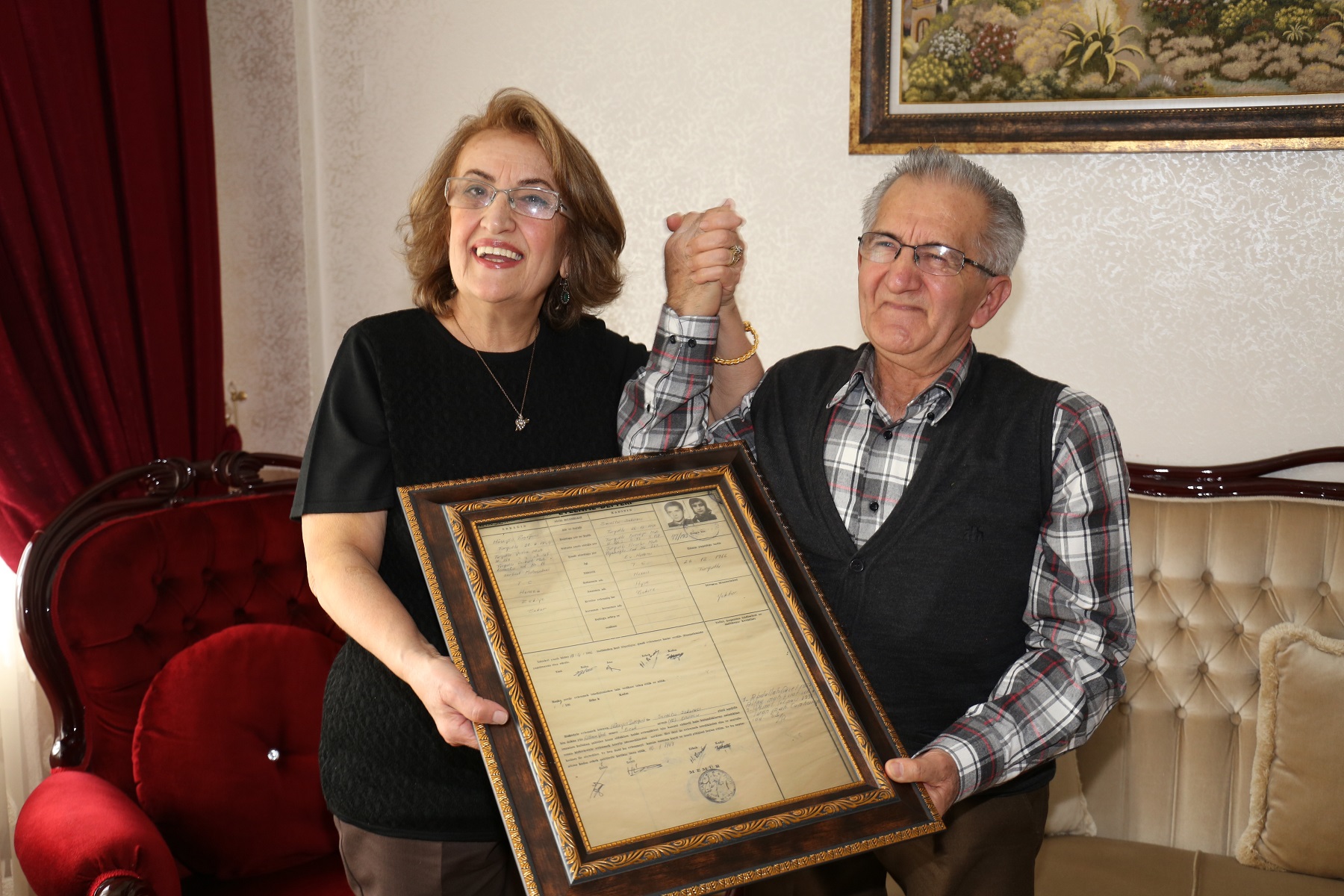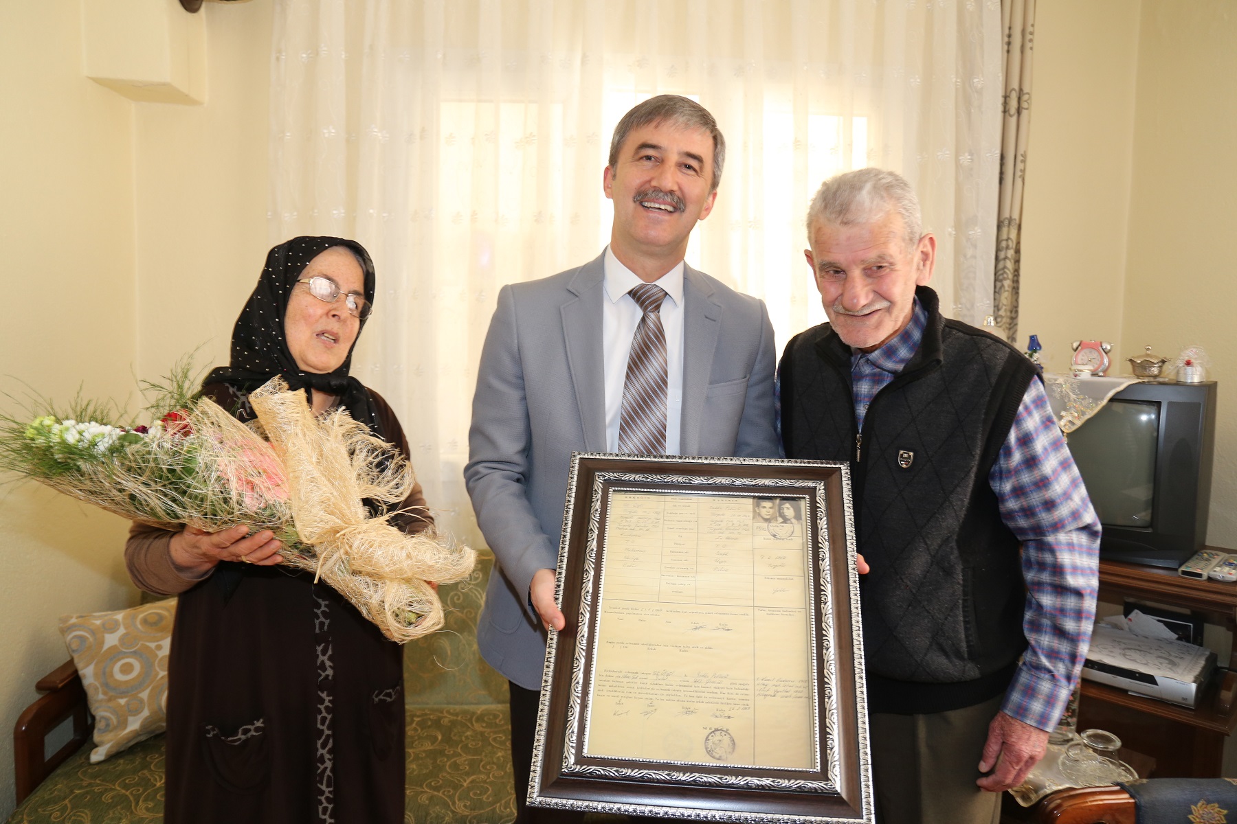Turgutlu Belediye Başkanı Turgay Şirin'e 'Sosyal Projelerde Yılın Belediye Başkanı' ödülünü getiren projeler arasında yer alan 'Gönül Projesi' ziyaretleri devam ediyor. Proje kapsamında evlilikte 50 yılı dolduran Ali-Sıdıka Ülgül çifti ile Hüseyin-Semiha Başeğerci çiftinin konuğu olan Belediye Başkanı Şirin, 50 yıllık çiftlere evlenme kütüğünün bir nüshası ile isimlerine özel bier saat hediye etti. Sevinçten gözyaşlarını tutamayan Ülgül ve Başeğerci çifti, anılarını tazeleyen Başkan Şirin’e teşekkür etti. Turgutlu Belediye Başkanı Turgay Şirin ilk olarak Şehitler Mahallesi sakinleri Ali-Sıdıka Ülgül çiftinin evlerine konuk oldu. Başkan Şirin’e Yazı İşleri Müdürü Adnan Erbaktı ile nikah memuru Ali Akça eşlik etti. Ülgül Çifti’ne çok özel hediyeler takdim eden Başkan Şirin “Yarım asır önce imzalamış olduğunuz nikah defterini hatırlamanız ve uzun yıllar başucunuzda bulunması adına, ilçemizin köklü ailelerini ziyaret etmeye devam ediyoruz. Sizler bizim baş tacımızsınız. Gençlere, yeni evlenecek olanlara örnek olmanız, onlara tavsiyeler vermeniz onlara yol göstermeniz bizler için paha biçilemez değerde. Çocuklarınız ve torunlarınızla daha nice 50 yıllar görürsünüz inşallah” dedi. Ülgül çiftinin mutlulukları gözlerinden okunurken, nikah defterindeki resimlerini görünce duygulanan çift, “50 yıl önce bu fotoğraflar çekilirken bizler çok gençtik. Bu fotoğrafları hatırlamıyoruz, baktığımızda kendimizi tanıyamıyoruz bile. Bizleri 50 yıl öncesine geri döndüren Belediye Başkanımız Turgay Şirin’e çok teşekkür ediyoruz. Bizleri çok duygulandırdı. Şimdiki gençler daha yürümeden koşmak istiyor. Bizler öyle değildik. 50 yıl emek verdik, kolay değil. Sevgi, saygı, hoşgörü, sabır evliliğin temelidir” şeklinde konuştular.“Tartışmalar Evliliğin Tuzu-Biberidir” Ülgün Çitfi ziyaretinin ardından Belediye Başkanı Turgay Şirin’in bir sonraki ziyareti Cumhuriyet Mahallesi sakinleri Hüseyin-Semiha Başeğerci çifti oldu. Başeğerci Çifti’ne, 50 yıl önceki evlenme kütüğünün bir resmi ile isimlerine özel bir saat hediye edilirken, Hüseyin Başeğerci, “50 yılda kavga bile etmedik. Tartışmalarımız da evliliğin tuzu, biberi oldu. Daha ileri gitmedi. Çok şükür bugünlerimize” dedi. Belediye Başkanı Turgay Şirin’in böylesine anlamlı bir projeyi gerçekleştirmesinden mutluluk duyduğunu ifade eden Hüseyin-Semiha Başeğerci Çifti, “Bizler topluma örnek olabilirsek, ne mutlu bizlere. Bizleri 50 yıl öncesine götürdüğünüz için çok duygulandık. Çok mutlu olduk. Şu fotoğraflar neredeyse çocukluk resimlerimiz. Dile kolay üzerinden yarım asır geçmiş. Gençler bizleri örnek alsınlar” dedi. Evlerinin kapılarını kendilerine açtıkları için Hüseyin-Semiha Başeğerci çiftine teşekkür eden Başkan Şirin ise, “Projemizin en güzel yanlarından biri, yıllardır tanıdığımız büyüklerimizin halini hatrını sorabilmek oldu. Kendilerini unutmadığımızı bilmelerini isterdik. Gönüllere girebiliyorsak ne mutlu bizlere” şeklinde konuştu.
