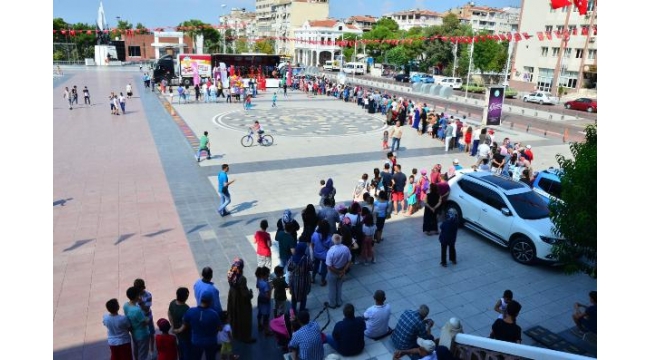 Bedava dondurma kuyruğu ULUSLARARASI Kahramanmaraş Dondurma ve Kültür Sanat Festivali'nin tanıtımı için yola çıkan dondurma TIR'ı Manisa'ya geldi. Cumhuriyet Meydanı'nda Manisalılar'a bedava 1 ton Kahramanmaraş dondurması dağıtılırken, almak isteyenler metrelerce kuyruk oluşturdu.Manisa'da Cumhuriyet Meydanı'nda Kahramanmaraş Belediyesi tarafından bedava dondurma dağıtıldı. Kahramanmaraş'ta yapılacak 2'nci Uluslararası Kahramanmaraş Dondurma ve Kültür Sanat Festivali'nin tanıtımı için yola çıkan dondurma TIR'ı Manisa'da ilgiyle karşılandı. Vatandaşlar bedava dondurma alabilmek için saatler öncesinden kuyruğa girdi. Dondurma kuyruğu metrelerce uzarken, sıcakta serinlemek isteyenler kuyruktan çıkmadı. Kahramanmaraş dondurması ustaları da çeşitli şovlar yapıp, vatandaşları eğlendirdi. Bazı vatandaşlar, dev Kahramanmaraş dondurmasını satırla kesmeye çalışırken zor anlar yaşadı. Kuyruk metrelerce uzayınca zaman zaman sıra tartışması da yaşandı. Dondurma dağıtımınının başlamasıyla birlikte dondurma adeta yarış yapıldı. Yüzlerce kişi Kahramanmaraş dondurmasının tadına baktı. Kahramanmaraş Büyükşehir Belediyesi Kültür ve Sosyal İşler Dairesi Personeli Şaban Yumruk, "Festivalimizin bu yıl 2'ncisini düzenliyoruz., Kahramanmaraş'ın değeri, markası olan dondurmayı şehirlerde tanıtmaya devam ediyoruz. Dondurma TIR'ımız festivalimizin Anadolu ayağını oluşturuyor. Asıl festival, 14-15 ve 16 Eylül'de gerçekleştirilecek. Dondurma TIR'ımız ile Anadolu'nun her şehrinde ortalama 1 ton dondurma dağıtıyoruz" dedi.