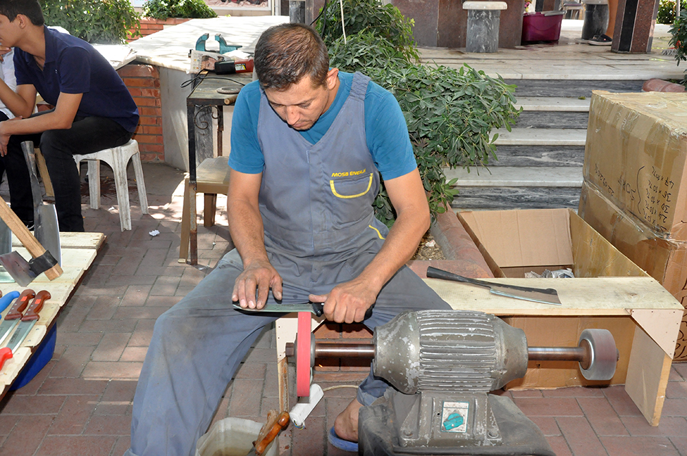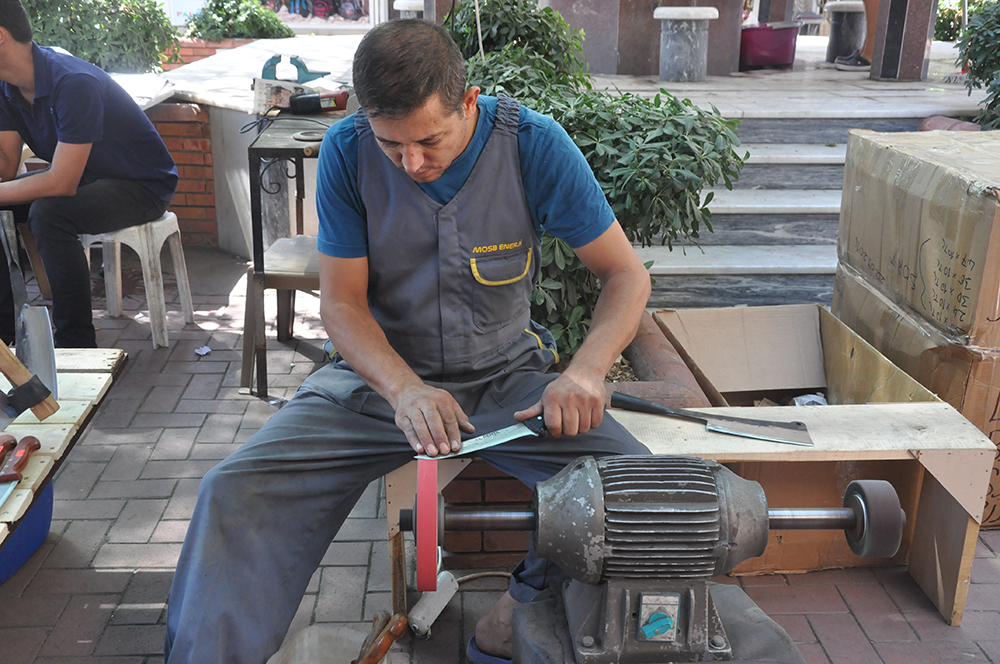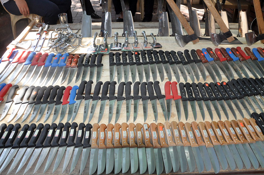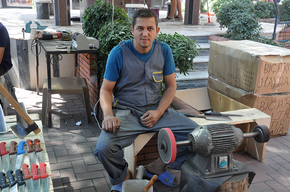 Bıçakçıların yoğun mesaisi başladı Yaklaşan Kurban Bayramı dolayasıyla kurbanlık kesiminde kullanılacak bıçakların bilemesi ve tamiri nedeniyle Manisa’nın Turgutlu İlçesi’nde yoğunluk yaşanıyor . Kurban Bayramı’na sayılı günler kala Turgutlu İlçesi’nde bıçakçılar müşterilerin getirdiği bıçakçıları hem biliyor hem tamirini yapıyor. Kurban Bayramı için üretilen yeni bıçakların tezgahlardaki yerini aldığı dükkanlarda, vatandaşların getirdikleri bıçaklar da bileme makinesiyle keskinleştiriyor. Bazı vatandaşlar kurban bayramı için yeni bıçak tercih ederken, bazıları ise eski bıçaklarını bileme işlemini yaptırıyor.Müşterileri ne bıçak biletme işini son güne bırakmaması için uyaran Hüseyin Öztosun , bıçak bileme 2.5 lira, bıçaklar ise 10 liradan 40 liraya kadar çıkıyor. Satırlar ise 25 liradan satılırken baltalarda 15 lira işlem görüyor .AHMET ÖZPEHLİVAN REFİK