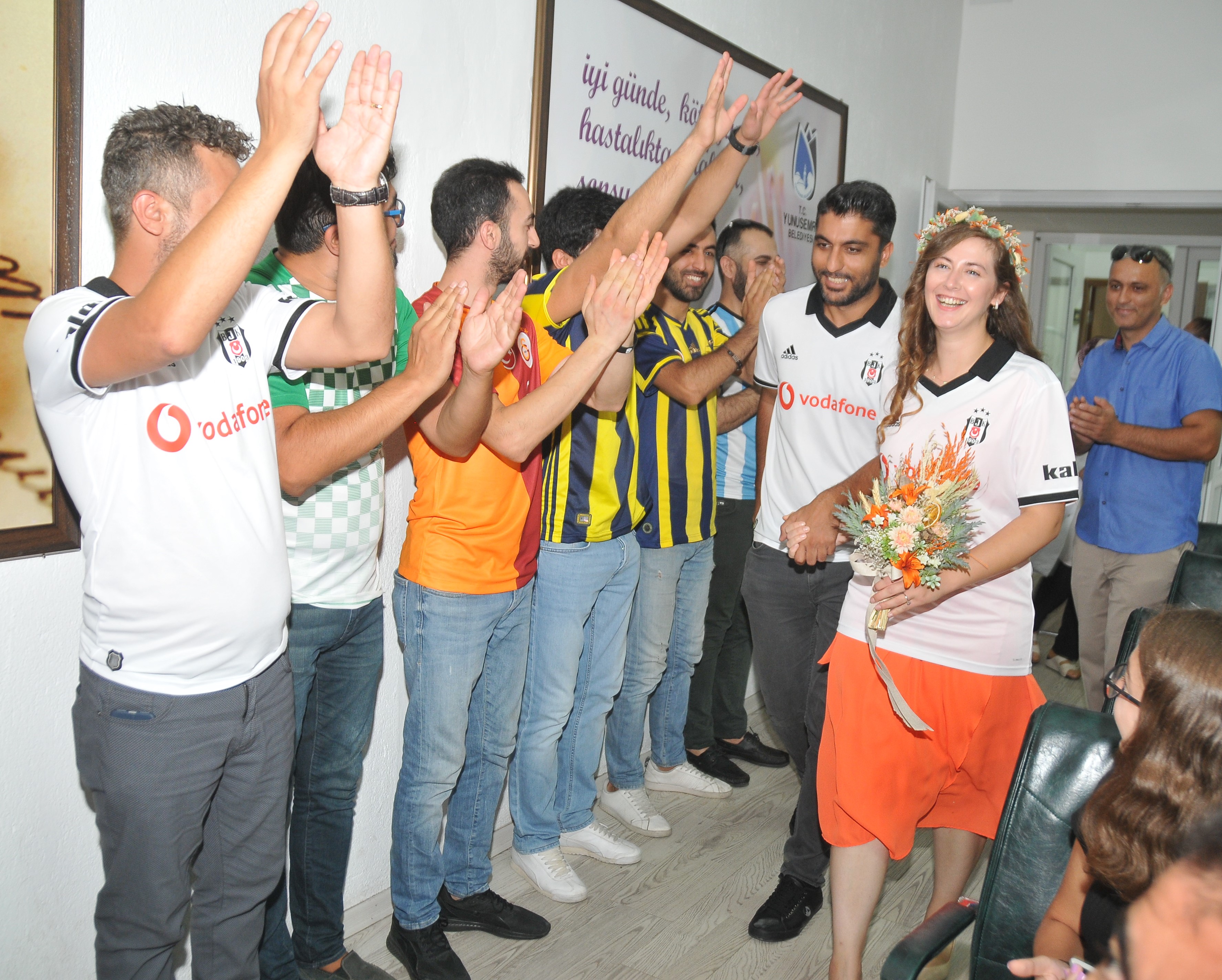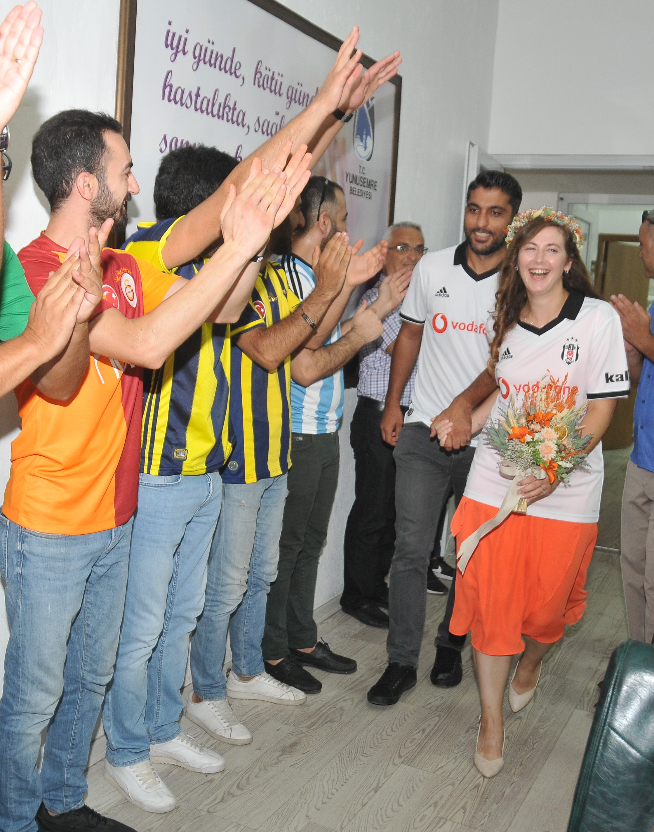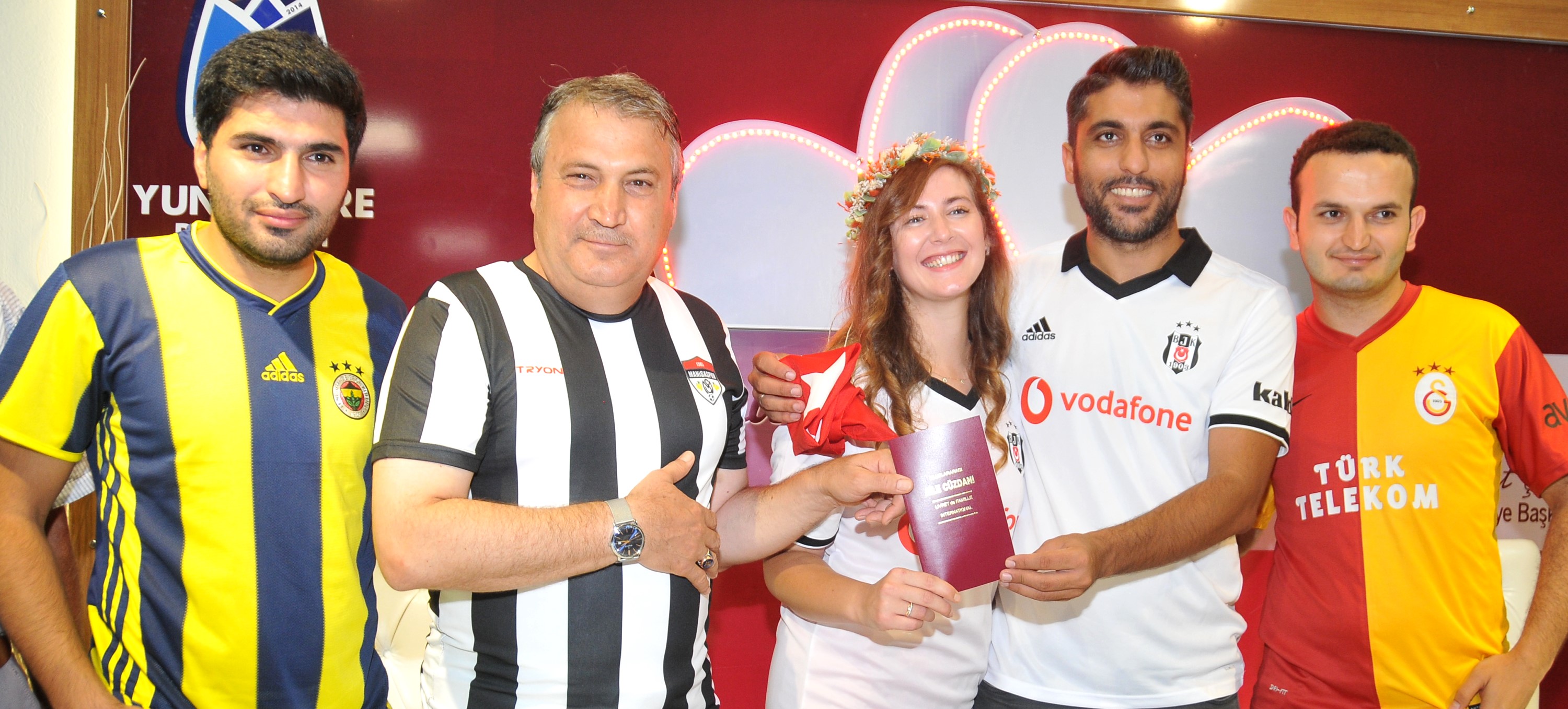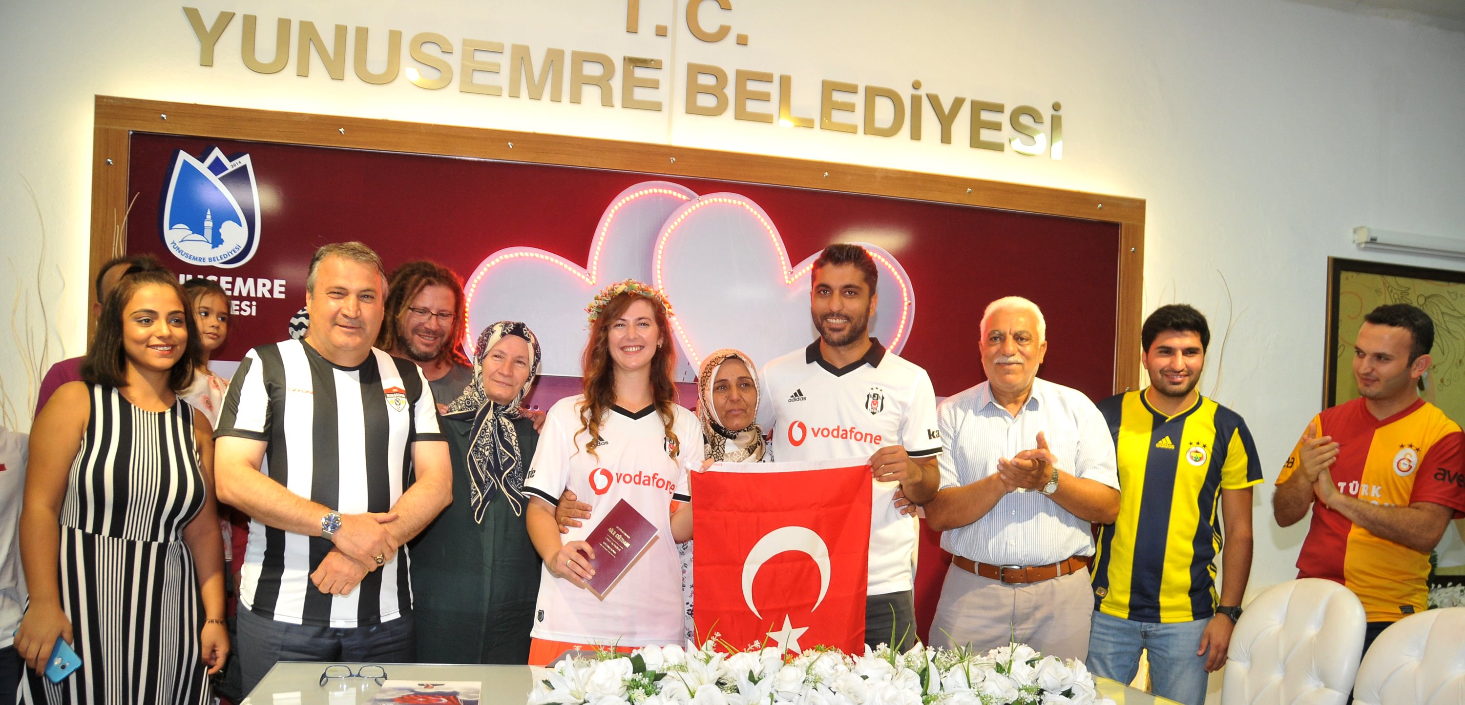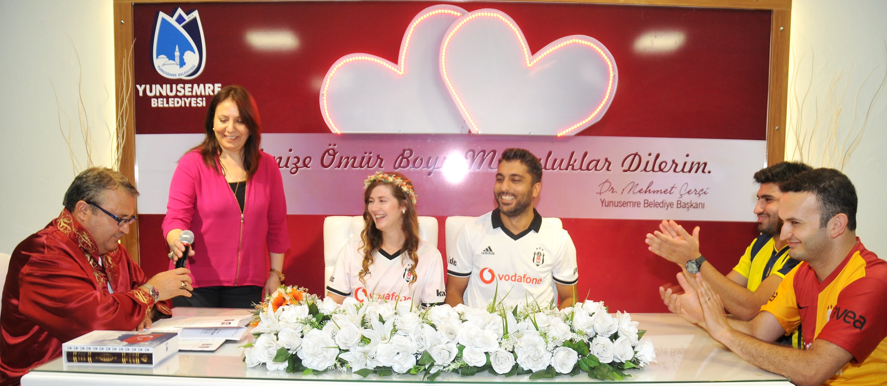 BİRİ GAZETECİ DİĞERİ HEMŞİRE İKİSİNİN ORTAK KALBİ 'BEŞİKTAŞ'Aydın’da ulusal bir Ajansın sorumluluğunu üstlenen gazeteci Ferdi Uzun, Manisa’da gazetecilik görevini sürdürdüğü sırada tanışıp nişanlandığı Celal Bayar Üniversitesi Hafsa Sultan Hastanesi Yeni Doğan Yoğun Bakım hemşiresi Yasemin Özdemir ile nikah masasına Beşiktaş formaları ile oturdu. Nikah öncesinde ve sonrasında ‘Kartal’ işaretinde bulunan Ferdi –Yasemin Uzun çifti salona girerken çeşitli takımların formalarının oluşturduğu arkadaşların yarattığı koridor içerisinde salona giriş yaptı. Uzun Çiftinin nikah şahitliklerini ise Fenerbahçe formasıyla Hakan Akdoğan, Galatasaray formasıyla Oğuzhan Şimşek üstlendi. Siyah beyaz Beşiktaş formalarıyla nikah masasına oturan Yasemin-Ferdi Uzun Çiftinin nikahlarını kıyan Manisa Yunusemre Belediye Başkanı Mehmet Çerçi, nikahın sonunda üzerindeki cübbeyi çıkartıp Manisaspor forması süprizinde bulundu. Başkan Çerçi,”Baktım nikahta Beşiktaş, Fenherbahçe,Galatasaray, Akhisarspor hatta Dersimspor ve bazı takımların formaları bulunuyor.Bende uzun yıllar süper ligde yer almış olan Manisaspor’un neden forması olmasın diyerek nikah öncesinde nikah kıydığım cübbemin altına giydim. Manisaspor renklerinde bu nikahta yeri olsun dedim.Genç çiftleri ömür boyu mutluluklar diliyorum” Başkan Çernçi, nikahlarını kıydığı Yasemin-Ferdi Uzun çiftine Kuran-ı Kerim ve Türk bayrağı hediye etti. 28 yaşındaki hemşire Yasemin ve 31 yaşındaki gazeteci Ferdi uzun çifti; “İkimizin ortak aşkı Beşiktaş ve siyah beyaz forma idi. ikimizde hayalimizi gerçekleştirmenin mutluluğunu yaşıyoruz. ailelerimizin gösterdiği anlayışından dolayı teşekkür ediyoruz” dedi Yasemin-Ferdi Uzun çifti ise düğün tarihlerini ise İzmir’in Kurtuluş günü olan 9 Eylül’ü belirlediklerini açıkladı.