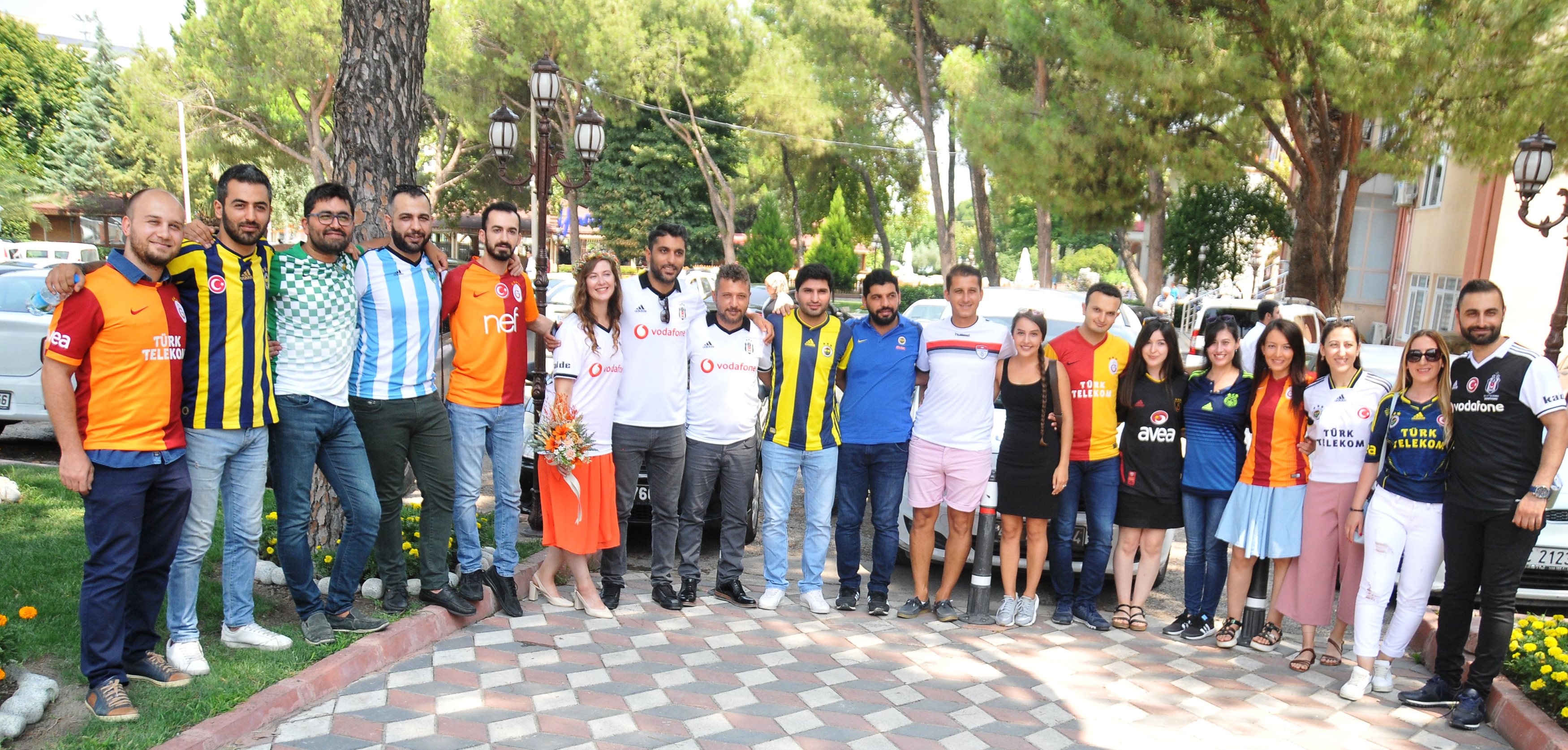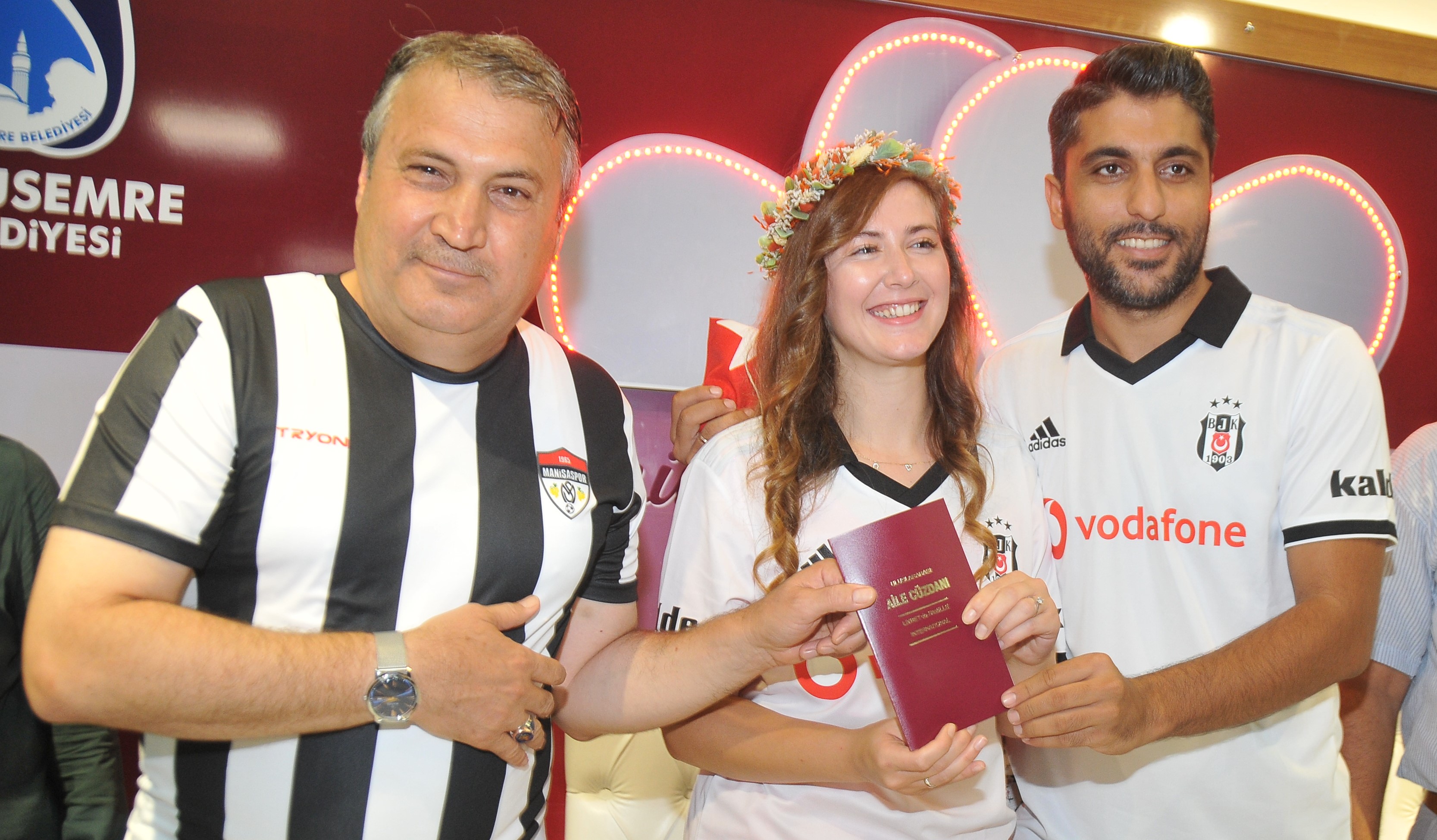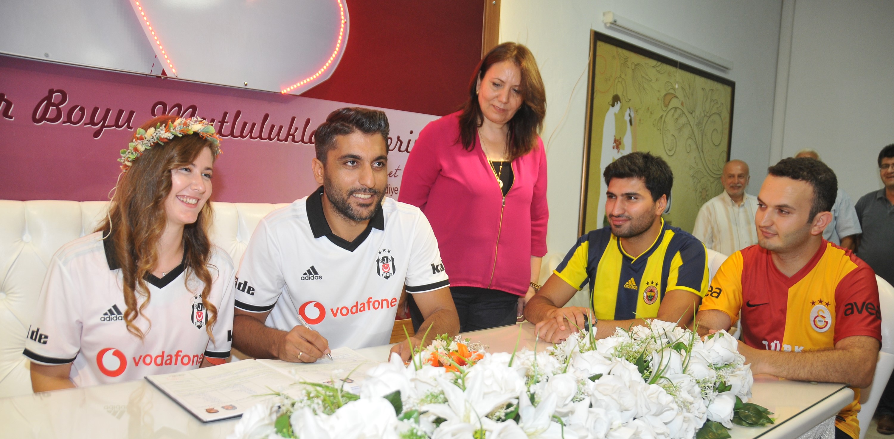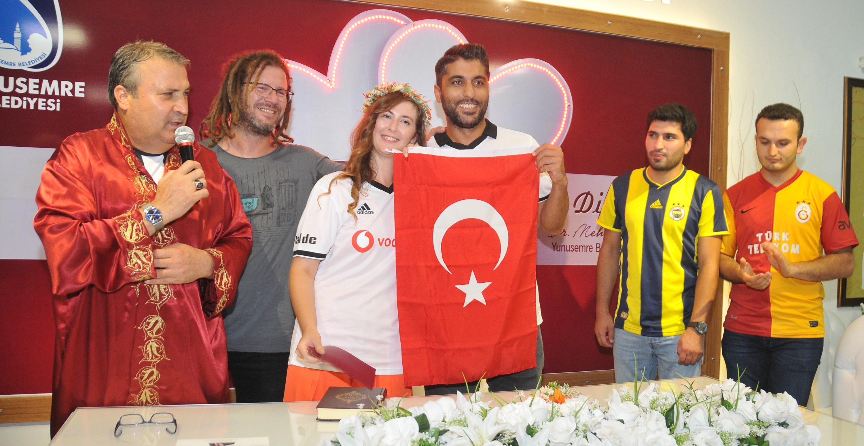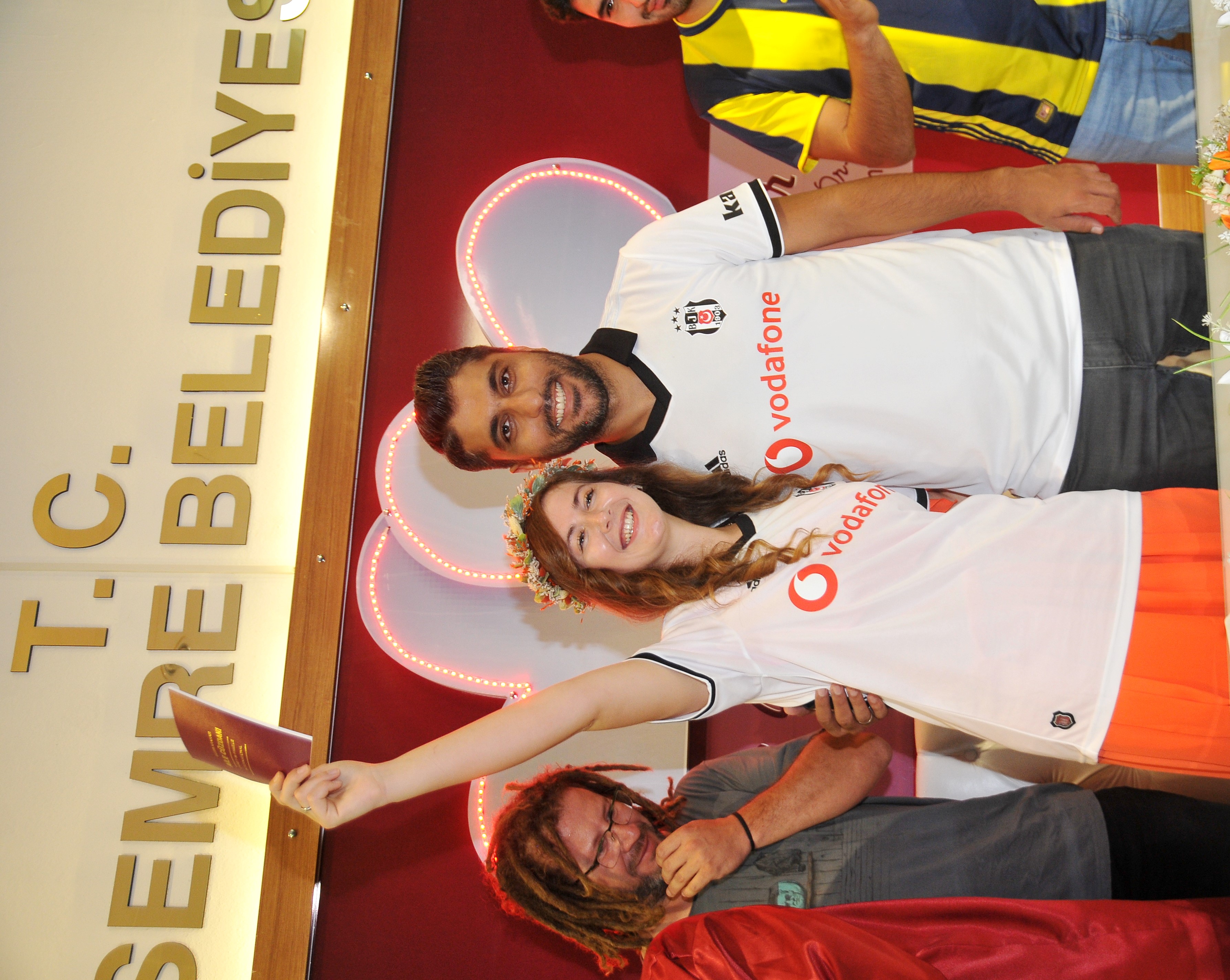 BİRİ GAZETECİ DİĞERİ HEMŞİRE İKİSİNİN ORTAK KALBİ 'BEŞİKTAŞ'Aydın’da ulusal bir Ajansın sorumluluğunu üstlenen gazeteci Ferdi Uzun, Manisa’da gazetecilik görevini sürdürdüğü sırada tanışıp nişanlandığı Celal Bayar Üniversitesi Hafsa Sultan Hastanesi Yeni Doğan Yoğun Bakım hemşiresi Yasemin Özdemir ile nikah masasına Beşiktaş formaları ile oturdu. Nikah öncesinde ve sonrasında ‘Kartal’ işaretinde bulunan Ferdi –Yasemin Uzun çifti salona girerken çeşitli takımların formalarının oluşturduğu arkadaşların yarattığı koridor içerisinde salona giriş yaptı. Uzun Çiftinin nikah şahitliklerini ise Fenerbahçe formasıyla Hakan Akdoğan, Galatasaray formasıyla Oğuzhan Şimşek üstlendi. Siyah beyaz Beşiktaş formalarıyla nikah masasına oturan Yasemin-Ferdi Uzun Çiftinin nikahlarını kıyan Manisa Yunusemre Belediye Başkanı Mehmet Çerçi, nikahın sonunda üzerindeki cübbeyi çıkartıp Manisaspor forması süprizinde bulundu. Başkan Çerçi,”Baktım nikahta Beşiktaş, Fenherbahçe,Galatasaray, Akhisarspor hatta Dersimspor ve bazı takımların formaları bulunuyor.Bende uzun yıllar süper ligde yer almış olan Manisaspor’un neden forması olmasın diyerek nikah öncesinde nikah kıydığım cübbemin altına giydim. Manisaspor renklerinde bu nikahta yeri olsun dedim.Genç çiftleri ömür boyu mutluluklar diliyorum” Başkan Çernçi, nikahlarını kıydığı Yasemin-Ferdi Uzun çiftine Kuran-ı Kerim ve Türk bayrağı hediye etti. 28 yaşındaki hemşire Yasemin ve 31 yaşındaki gazeteci Ferdi uzun çifti; “İkimizin ortak aşkı Beşiktaş ve siyah beyaz forma idi. ikimizde hayalimizi gerçekleştirmenin mutluluğunu yaşıyoruz. ailelerimizin gösterdiği anlayışından dolayı teşekkür ediyoruz” dedi Yasemin-Ferdi Uzun çifti ise düğün tarihlerini ise İzmir’in Kurtuluş günü olan 9 Eylül’ü belirlediklerini açıkladı.