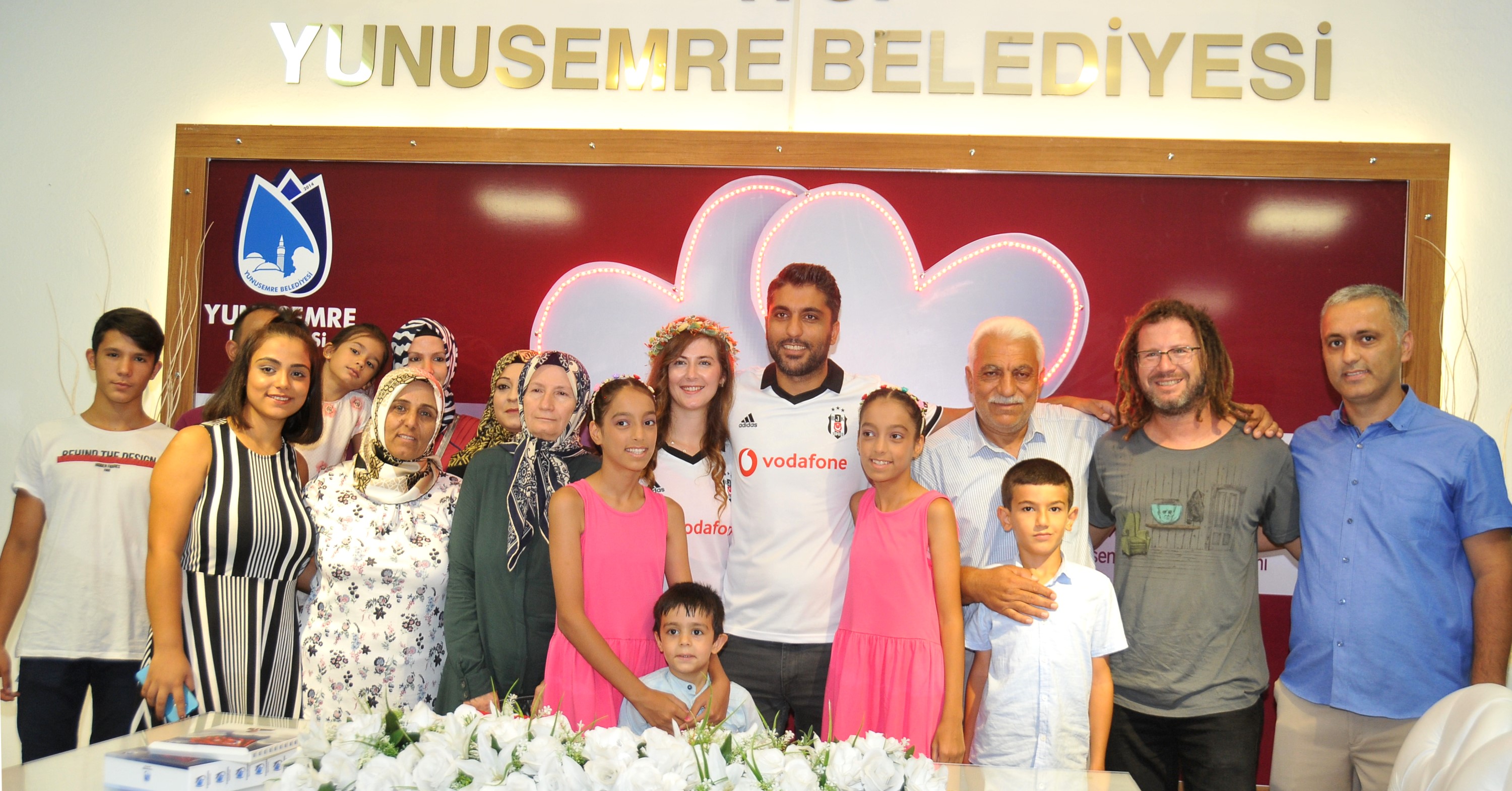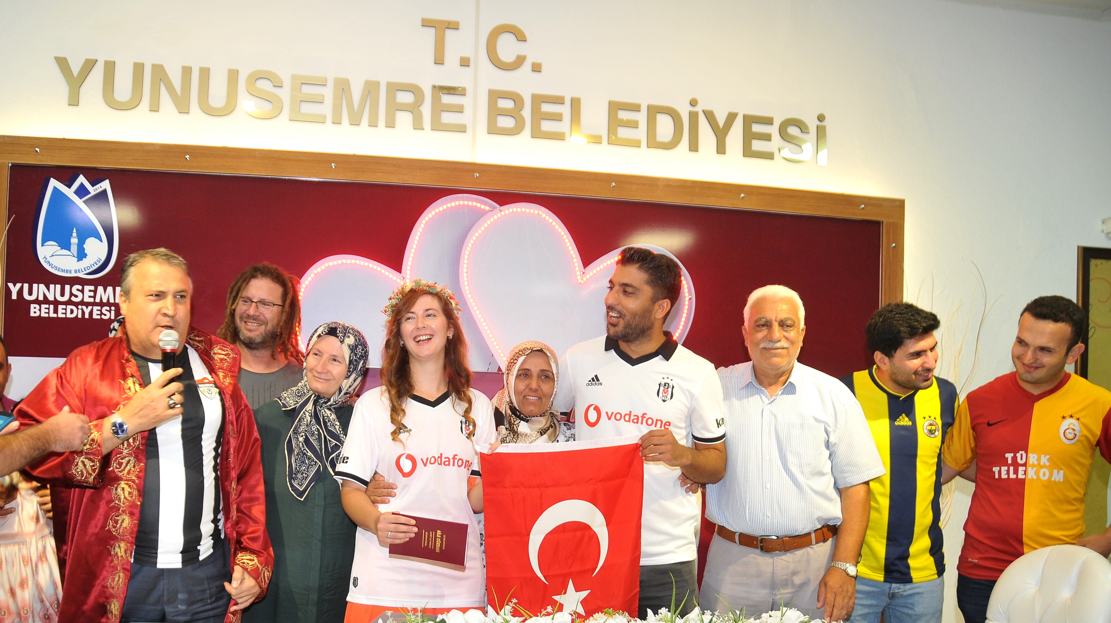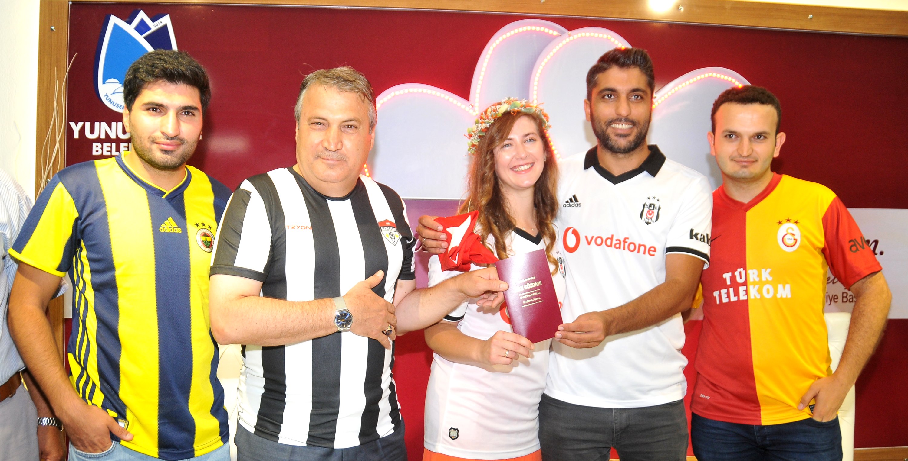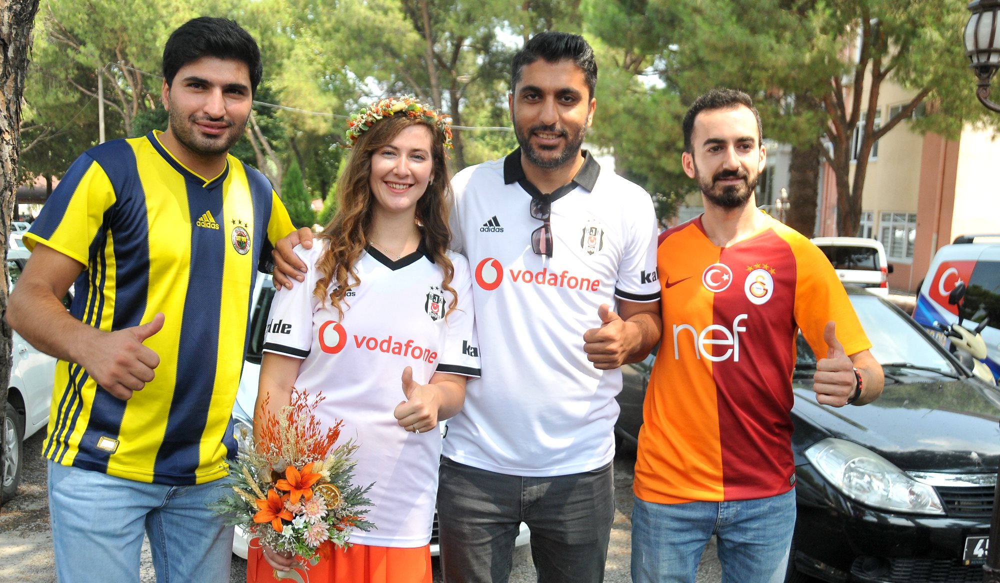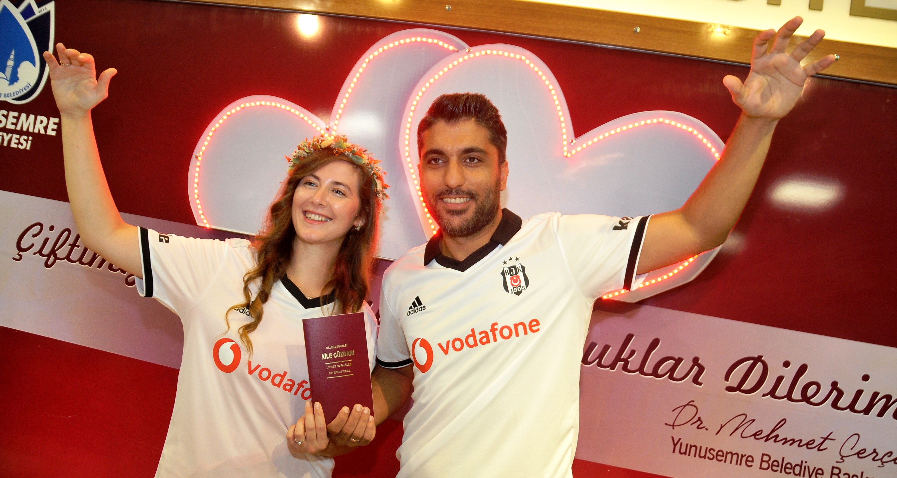 BİRİ GAZETECİ DİĞERİ HEMŞİRE İKİSİNİN ORTAK KALBİ 'BEŞİKTAŞ'Aydın’da ulusal bir Ajansın sorumluluğunu üstlenen gazeteci Ferdi Uzun, Manisa’da gazetecilik görevini sürdürdüğü sırada tanışıp nişanlandığı Celal Bayar Üniversitesi Hafsa Sultan Hastanesi Yeni Doğan Yoğun Bakım hemşiresi Yasemin Özdemir ile nikah masasına Beşiktaş formaları ile oturdu. Nikah öncesinde ve sonrasında ‘Kartal’ işaretinde bulunan Ferdi –Yasemin Uzun çifti salona girerken çeşitli takımların formalarının oluşturduğu arkadaşların yarattığı koridor içerisinde salona giriş yaptı. Uzun Çiftinin nikah şahitliklerini ise Fenerbahçe formasıyla Hakan Akdoğan, Galatasaray formasıyla Oğuzhan Şimşek üstlendi. Siyah beyaz Beşiktaş formalarıyla nikah masasına oturan Yasemin-Ferdi Uzun Çiftinin nikahlarını kıyan Manisa Yunusemre Belediye Başkanı Mehmet Çerçi, nikahın sonunda üzerindeki cübbeyi çıkartıp Manisaspor forması süprizinde bulundu. Başkan Çerçi,”Baktım nikahta Beşiktaş, Fenherbahçe,Galatasaray, Akhisarspor hatta Dersimspor ve bazı takımların formaları bulunuyor.Bende uzun yıllar süper ligde yer almış olan Manisaspor’un neden forması olmasın diyerek nikah öncesinde nikah kıydığım cübbemin altına giydim. Manisaspor renklerinde bu nikahta yeri olsun dedim.Genç çiftleri ömür boyu mutluluklar diliyorum” Başkan Çernçi, nikahlarını kıydığı Yasemin-Ferdi Uzun çiftine Kuran-ı Kerim ve Türk bayrağı hediye etti. 28 yaşındaki hemşire Yasemin ve 31 yaşındaki gazeteci Ferdi uzun çifti; “İkimizin ortak aşkı Beşiktaş ve siyah beyaz forma idi. ikimizde hayalimizi gerçekleştirmenin mutluluğunu yaşıyoruz. ailelerimizin gösterdiği anlayışından dolayı teşekkür ediyoruz” dedi Yasemin-Ferdi Uzun çifti ise düğün tarihlerini ise İzmir’in Kurtuluş günü olan 9 Eylül’ü belirlediklerini açıkladı.