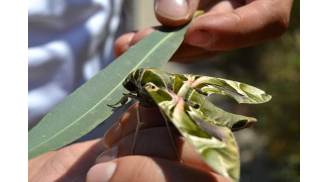 MANİSA'nın Salihli ilçesinde, bir kır bahçesinin işletmecisi Murat Güngör, bitkin halde bulduğu askeri kamuflaj desenli Mekik Kelebeği'ni eliyle besliyor. Güngör, zakkum çiçeği ile beslediği kelebeği sağlığına kavuşmasının ardından doğal ortamına bırakacağını söyledi.Salihli'deki Kurşunlu Kaplıcaları yakınlarındaki bir kır bahçesinin işletme müdürü Murat Güngör, bitkin halde bir Mekik Kelebeği (daphnis nerii) buldu. Güngör, Akdeniz ve Ege kıyı şeridinde rastlanan kelebeği elleriyle zakkum çiçeği ile besledi. İri boy ve renkli, uzun ince kanatlarıyla dikkat çeken Mekik Kelebeği, en hızlı kanat çırpan, havada asılı durabilen kelebekler olarak biliniyor. Yalnızca gece uçabildiği belirtilen Mekik Kelebeği, geniş yapraklı ağaç, süs sarmaşığı, zakkum ve sebze yapraklarıyla besleniyor. Mekik kelebeği, bölgenin, hala nadir özelliklerini ve doğal koşullarını taşıdığının da bir göstergesi. Kelebek, narin yapısıyla da göz kamaştırıyor. Kanatları yeşil, kahverengi, pembe, sarı renklerle bezeli olan Mekik Kelebeği daha önce de Türkiye'nin bazı bölgelerinde görülmüştü.Murat Güngör, "Çalıştığım kır bahçesinde gezerken çiçeklerin üzerinde oldukça sıra dışı bir görünüşe sahip olan kelebek gördüm. Yanına gittiğimde kelebeğin bitkin bir halde olduğunu fark ettim. Hemen işletmemizde bir bölüme götürerek kelebek hakkında internette araştırma yaptım. Kelebeğin mekik kelebeği olduğunu ve zakkum çiçeği yaprakları ile beslendiği yazıyordu. Tesislerimizde bulunan zakkum çiçeği yaprakları ile beslemeye başladım" dedi.Güngör, kelebeği sağlığına kavuşmasının ardından tekrar doğal ortamına bırakacağını söyledi.