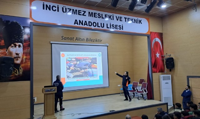 Manisa Büyükşehir Belediyesi İtfaiye Dairesi Başkanlığı ‘Ateşin Kahramanları Gençlerle Buluşuyor Projesi’ kapsamında, Turgutlu İnci Üzmez Mesleki ve Teknik Anadolu Lisesi öğrencileriyle buluştu. İtfaiyecilik mesleğinin tanıtıldığı buluşmada, öğrencilerin konuyla ilgili soruları da yanıt buldu.Gençlere itfaiyeyi tanıtmak, önemini kavratmak ve çalışmalarını anlatmak amacıyla Manisa Büyükşehir Belediyesi İtfaiye Dairesi Başkanlığı tarafından hayata geçirilen ‘Ateşin Kahramanları Gençlerle Buluşuyor Projesi’ kapsamında, Turgutlu İnci Üzmez Mesleki ve Teknik Anadolu Lisesi öğrencileri, itfaiyecilerle buluştu. İtfaiye Dairesi Başkanı Gürhan İnal ve eğitmen Mehmet Ateş, öğrencilere itfaiyecilik mesleğini anlattı. Etkinliğe Turgutlu Muhtarlık İşleri Şube Müdürü Necati Abalı da katıldı. Programda Manisa Büyükşehir Belediyesi İtfaiye Dairesi Başkanlığının yaptığı faaliyetlerin yer aldığı sunum da gerçekleştirildi. Öğrencilerin ilgiyle takip ettiği programda, itfaiyecilik konusunda merak ettikleri sorular da yanıt buldu. Programın sonunda Okul Müdürü Suat Kesemen’e, İtfaiye Dairesi Başkanı Gürhan İnal tarafından projeye desteklerinden dolayı teşekkür belgesi takdim edildi. Daha sonra Manisa Büyükşehir Belediye Başkanı Cengiz Ergün'ün gönderdiği hediyeler de öğrencilere takdim edildi. Okul yönetimi, programın düzenlenmesinde emeği geçenlere teşekkür etti.Haber Merkezi