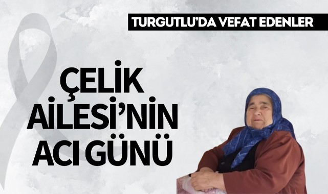 Çelik Ailesi’nin Acı GünüTurgutlu ilçesi sakinlerinden Fatma Çelik yaşamını yitirdi. Cenazesi bugün Niyazi Üzmez Camii’nde ikindi namazını müteakip kılınacak cenaze namazından sonra Yeni Kabristan’da toprağa verilecek.Yakınları; Oğlu: Mustafa Çelik, Kızları; Emine Çakırçoban, Kezban Uslu, Hacer Coşkun, Damadı: Ercan CoşkunMerhumeye Allah'tan rahmet, yakınlarına başsağlığı dileriz.