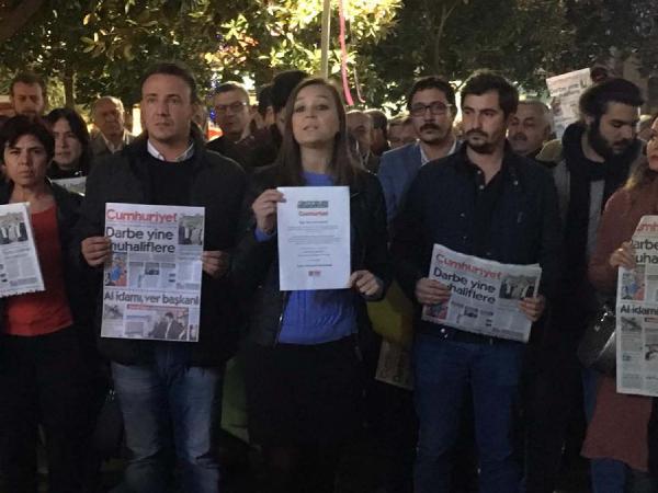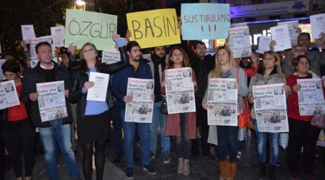CHP'li gençlerden 'Cumhuriyet'e destek CHP Manisa İl Gençlik Kolları üyeleri, Cumhuriyet Gazetesi'nin yazarları ile yöneticilerine yönelik yapılan operasyona tepki göstermek amacıyla basın açıklaması yaptı, bildiri dağıttı. CHP Manisa İl Gençlik Kolları üyeleri, Cumhuriyet Gazetesi'nin yazarlarına ve yöneticilerine yapılan operasyona tepki göstermek için Şehzadeler'deki 15 Temmuz Demokrasi Meydanı'nda dün akşam bir araya geldi. 100 kişilik grubun katıldığı eylemde, 'Özgür basın susturulamaz' sloganı atıldı. Açıklama yapan CHP İl Gençlik Kolları Başkanı Gülşah Durbay, Cumhuriyet Gazetesi'ne yapılan operasyonun halkın haber alma hakkına yapılmış bir saldırı olduğunu söyledi. Operasyonu hukuksuzluk olarak değerlendiren Durbay, "AKP iktidarı 15 Temmuz darbe girişimi üzerine ilan ettiği OHAL'in fırsatçılığını yapmaya devam ediyor. Yıllarca ilişki içerisinde suç ortaklığı yaptığı bir yapının intikamını bizlerden alıyor. Cumhuriyetin kurulduğu yıllardan beri halkın haber alma hakkını savunan, Cumhuriyet değerlerinden ve doğrudan yana olan Cumhuriyet gazetesi bugün iktidarın hedefinde. Devletin cemaatlere teslim edildiğini ifşa ettiği için geçtiğimiz yıllarda linç edilen gazeteciler, şimdi gözaltında. İktidarın yaptığı bir imha operasyonudur. Hukuksuzluktur, adaletsizliktir. Haber alma hakkımıza ve değerlerimize saldırıdır. İzin vermeyeceğiz. Cumhuriyet Gazetesi susmayacak" dedi. CHP Gençlik Kolları Genel Başkan Yardımcısı Cenk Erdöl'ün de katıldığı eylemden sonra topluluk, ellerindeki 'Özgür Basın Susmayacak' başlığını taşıyan bildirilerini ve Cumhuriyet gazetelerini halka dağıttı. dha