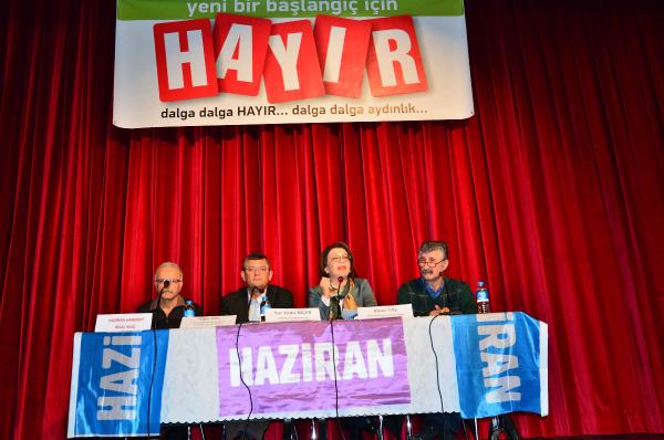 Manisa'da Haziran Hareketi tarafından Kültür Merkezi Tiyatro Salonu'nda referandumda 'hayır' konulu panel düzenlendi. Haziran Hareketi'ni Manisa temsilcisi Bilal Kılıç'ın moderatörlüğünde düzenlenen panele CHP Grup Başkanvekili ve Manisa Milletvekili Özgür Özel, CHP Manisa Milletvekili Tur Yıldız Biçer ve Özgürlük ve Düşünce Partisi (ÖDP) Başkanlar Kurulu Üyesi Alper Taş konuşmacı olarak katıldı. Panelde konuşan Milletvekili Özel, son anketlere göre 'hayır' oylarının önde olduğunu söyledi. Özel, "Anketler de öyle gösteriyor. Yüzde 41 kesin 'hayır' diyor. Bir yüzde 32-34 var, kesin 'evet' diyecek. 'Kararımı değiştirebilirim' diyenler üzerinden baktığımızda onların önemli bir kısmının 'evet'e daha yakın olduğunu görüyoruz. Mesele yüzde 16'lık bir kararsızın ne diyeceğinde geliyor düğümleniyor. Anayasa Komisyonu'na giderken taslak, yüzde 43 'evet' yüzde 41 'hayır'. Komisyon, meclis süreci, ama burada komisyonda ve mecliste bizim yaptıklarımız kadar Barolar Birliği'nin meclisin kapısına kadar yürüyüp biber gazı yemesinden tutun Birleşik Haziran'ın sosyal medyada, sokakta, her yerde ve toplumdaki tüm dinamikleri cesaretlendiren enerjisi ve neşesi, 'hayır' cephesinde yer alan herkesin inanması, içeriği konuşması, sesi yüksek de olsa sempatisi yüksek söylemleri sonucunda ve meclisteki mücadelenin sonucunda iş bir anda değişti. Yüzde 43 olan 'evet' 41'e, 41'de olan 'hayır' yüzde 46'ya yükseldi. 2 puan gerideydik, 4 ila 6 puan ileriye geçtik. Bizim yüzde 41'imizi yeniden ikna etme gibi bir derdimiz yok. Bizim doğru bir dil, yüksek bir motivasyon ama hiç kimseyi ötekileştirmeden, korkutmadan, üzmeden kaygılandırmadan 'hayır'a ikna etmek gibi bir görevimiz var" dedi."KILIÇDAROĞLU BAŞKAN OLSA DA KARŞIYIZ" CHP Genel Başkanı Kemal Kılıçdaroğlu başkan seçilse dahi başkanlık sistemine karşı olduklarını kaydeden CHP'li Özel, "Bugün geldiğimiz noktada kimin olduğu hiç önemli değil. Son söylediğimiz lafı ilk baştan söylüyoruz. Seçilecek ilk başkan da son başkan da Kemal Kılıçdaroğlu da olsa biz başkanlık sistemine karşıyız" dedi."MHP'DE TABAN YÜZDE 80 HAYIR DİYOR" MHP Genel Başkanı Devlet Bahçeli'ye rağmen MHP tabanının yüzde 80'inin 'hayır' diyeceğini savunan Özel, "Cumhurbaşkanı'nın 15 Temmuz gecesi 'Bu Allah'ın bir lütfu' sözünü belki de bu salona Türkiye'de bundan önce defalarca iktidar partisine oy vermiş kişilerin bile kafasının karışık olmasına, Milliyetçi Hareket Partisi'nin, hem de disiplinli bir lider partisi olarak görülen bir partinin tabanının yüzde 80'inin bu meseleye 'hayır' diyor oluşuna ve aslında AKP ile çok benzer siyasi geleneklerden gelen sağdaki partilerin dahi 'Okumazsak hayır' ama içeriğini okuyunca bu taslağa 'evet' demesine bakarak herhalde şunu söylemek mümkün. Bu referandum hepimiz için Allah'ın bir lütfudur. Bu referandumda 15 yıldır kendi hegemonyasını kuran, kendi hegemonik dilini ele geçirdiği devlet imkanlarıyla besleyen, sizin doğrunuzun 2.5 televizyon kanalında, yaşatmak ve gözümüz gibi bakmak zorunda olduğumuz üç dört gazetede ifade edilirken; onların 47 televizyon kanalı, 25 gazetesiyle kendi yanlışlarını anlatmaya çalıştıkları bir süreçten sonra şimdi işler ne olursa olsun onlar için ters gidiyor" diye konuştu."TERÖR ÖRGÜTLERİ MEMNUN"Cumhurbaşkanı Recep Tayyip Erdoğan'ın Elazığ ve Malatya'da düzenlediği mitinglerinde söylediği "Kandilden talimat geliyor. 'Hayır diyeceksiniz' diyor. 'Hayır' diyenler onlarla aynı değil mi?" sözlerini sert bir dille eleştiren Özel, "Dün Elazığ, Malatya'yı gördünüz. İki şeyin üzerine oturtuyor. Birincisi hakaretle, iftirayla bu ülkenin güzel insanlarına, bu ülkenin sevimli insanlarına, bu ülkede doğdukları için ve bu ülkeyi birbirleriyle paylaştıklarıyla seven, meseleyi başka ayrımlarla aralarında duvarlar örmeyen insanlarına diyor ki 'Sizler teröristlerle birliktesiniz'. Oysa aklı başında hiç bir devlet terör örgütlerinin adını anmaz. Der ki; 'Sözde terör örgütü. Terör örgütünün sözde temsilcisi. Terör örgütünün sözde başkanı' Çünkü bomba patlatanın bir tane amacı vardır, adından söz ettirmek. Suikast yapanın bir tane amacı vardır, yaydığı korku üzerinden kendinden bahsettirmek. Bugün tahmin ediyorum onun adını saydığı benin saymayacağım bütün terör örgütleri iktidarın ve Devlet Bahçeli'nin benimsemiş olduğu bu yöntemden çok memnun. Günde 10 sefer 30 kanalda 3 farklı ağızda isimleri anılıyor. Ve onlar sanki bu ülkenin kaderine etki edebilecekmiş güçteymiş, referandumun kaderini belirleyebilecek, bu ülkede kitleleri yönlendirebilecek güçteymiş gibi gösteriliyorlar. Oysa bu ülkenin kaderini sadece ve sadece bir tek grup belirleyebilir" dedi. DHA