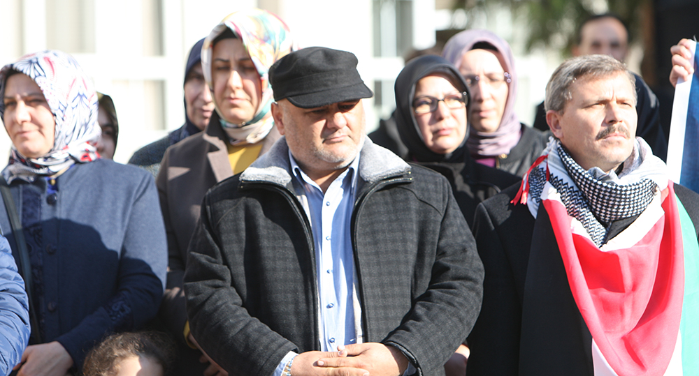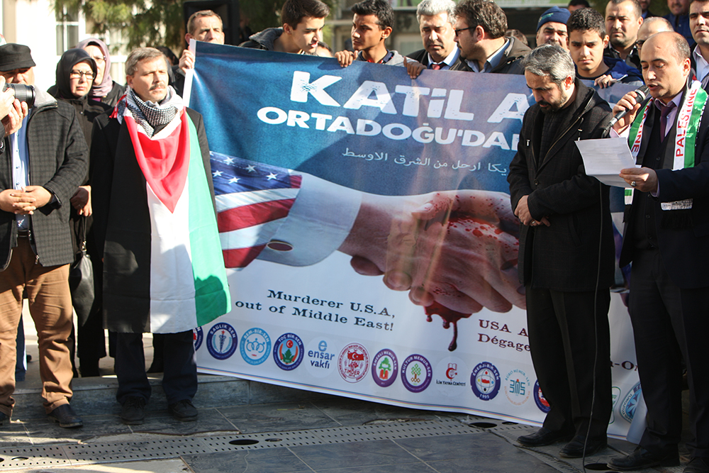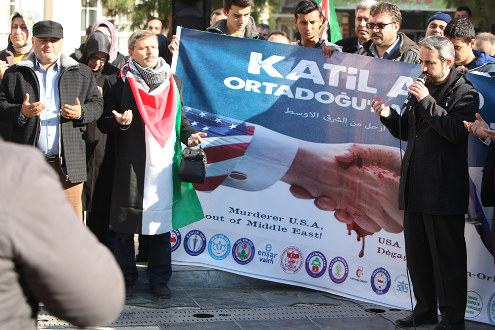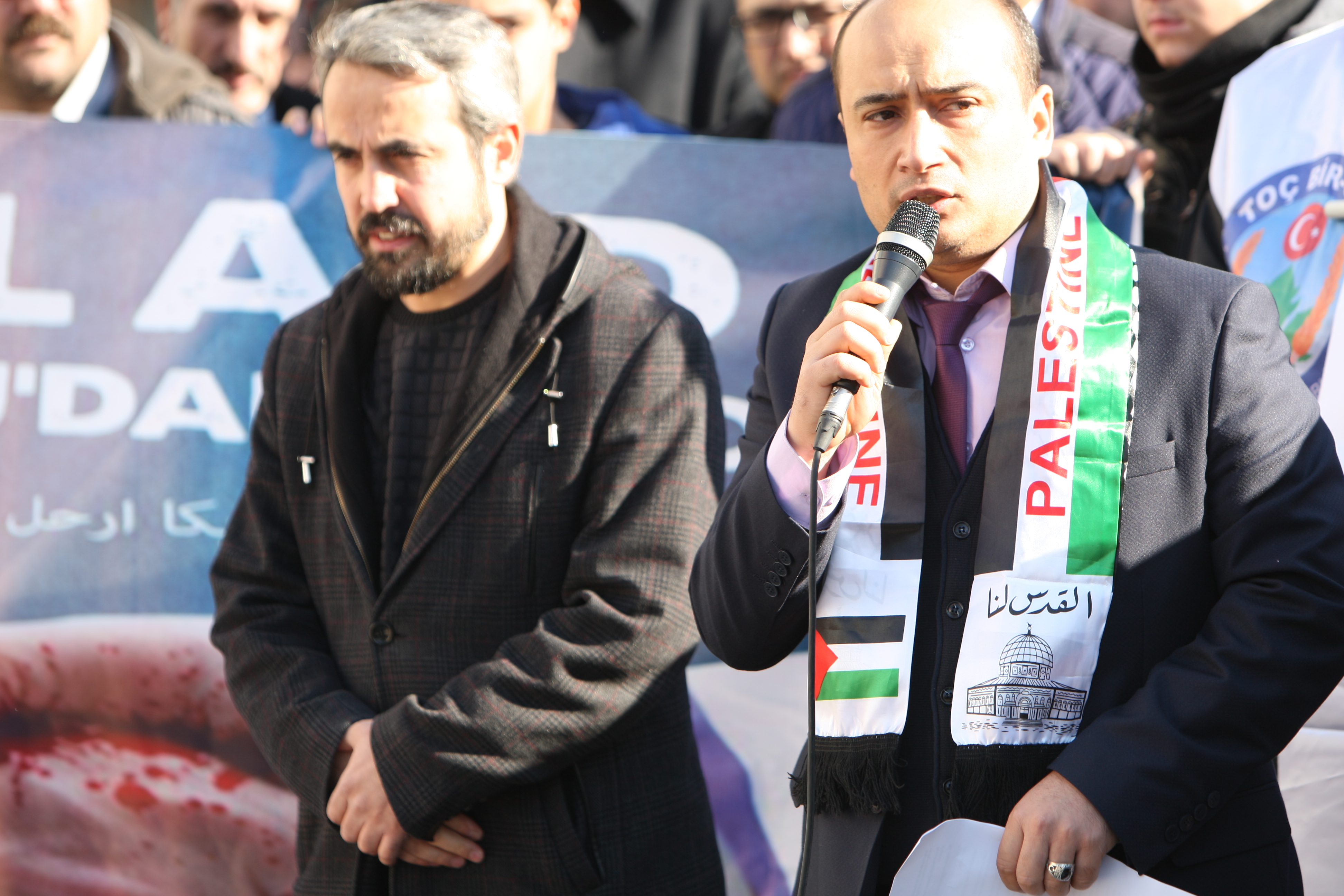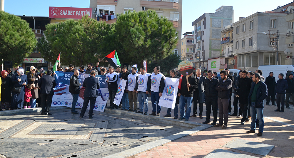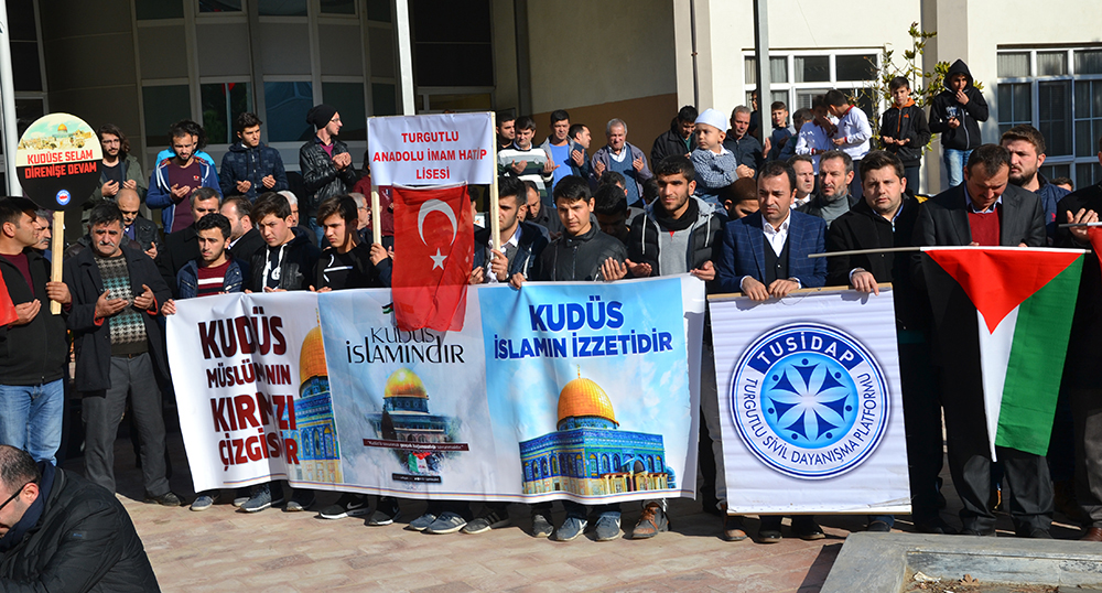 ABD’nin Kudus’ü İsrail’i başkenti olarak tanımasının ardından bugün Türkiye’nin bir çok yerinde protesto gösterileri gerçekleştiriliyor. Cuma namazı sonrası cami önlerinde toplanan vatandaşlar pankart ve sloganlarla ABD ve İsrail’i protesto ediyor.ABD Başkanı Donald Trump'ın Kudüs'ü İsrail'in başkenti olarak tanıyacağını açıklaması tüm yurtta olduğu Manisa’nın Turgutlu İlçesi’nde de Cuma Namazı sonrasında protesto edildi.TUSİDAP(Turgutlu Sivil Dayanışma Platformu) : Eğitim Bir Sen , İlim Yayma Cemiyeti, Ensar Vakfı, TUR-TİMDER, Turgutlu Din görevlileri Ve Din Gönüllüleri Derneği, İHH Turgutlu,Sağlık Sen, Bem Bir Sen, Büro Memur Sen, Toç Bir Sen, AKP Turgutlu ve SP Turgutlu İlçe Teşkilatınında kaılımların bulunduğu eylem bugün Pazar Camii’nde kılınan Cuma naması sonrasında cami karşında parkta toplanan grup pankart ve sloganlarla ABD ve İsrail’i protesto ettiPlatform adına basın açıklamasını okuyan Mehmet Taşçı “Amerika Birleşik Devletleri Başkanı Donald Trump’ın hukuksuz Kudüs açıklaması, insanlık vicdanını yaralamış ve bölgemizdeki sorunları derinleştirmiştir.” DediSP Turgutlu İlçe Başkanı ve AKP Turgutlu İlçe Başkanı Mürşit Gedizli’nin ardından konuşan Taşçı’nın konuşmasında bazı satır başları şu şekilde:Sayın Cumhurbaşkanımız’ın kesin şekilde ilan ettiği üzere Kudüs, tüm Müslümanların kırmızı çizgisidir.Bu, bölgemizde barışı ve istikrarı tehdit etmeye yönelik bir adımdır..İslam’ın sesini susturmak, kendi kurguları olan terör örgütlerini bahane ederek Müslümanların iradelerini esir etmek isteyenler, tarihte defalarca olduğu gibi yine hüsrana uğrayacaklardır.İslam’ın harem-i izzeti olan Kudüs’ü tacize teşebbüs edenler, Türküyle, Arabıyla, Kürdüyle tüm Müslümanlarda Selahaddin Eyyubi ruhunun dirilip karşılarına dikildiğini göreceklerdir.Türkiye’nin, İnsanlığın silüeti olan Kudüs’ün mahremiyetine yönelik bu saldırı karşısında Cumhurbaşkanımızın liderliğinde ortaya koyduğu güçlü tepkinin sonuna kadar arkasındayız.Dünyadaki tüm Müslümanların, İslam İşbirliği Teşkilatı Zirve Dönem Başkanı olan Türkiye’nin çağrısına kulak vererek Kudüs’e sahip çıkacağına inanıyoruz.Diğer taraftan, Amerika Birleşik Devletleri’nin bu kararı, dünyada yaşanan adaletsizliğin yeni bir tezahürüdür.Bu hadise, Cumhurbaşkanımızın, küresel sistemin çarpıklıklarına ve adaletsizliklerine karşı uzun zamandır dile getirdiği “dünya 5’ten büyüktür” itirazının haklılığını teyit etmiştir.İslam’ın kalbine saplanmaya çalışılan bu hançere, ancak tüm Müslümanların iki elin parmaklarının kenetlenmesi gibi bütünleşmesiyle engel olabiliriz.Biz müslümanlar olarak Kudüs davası ve ümmetin birliği için her türlü çabayı göstermeye, her türlü fedakarlıkta bulunmaya hazırız.Bütün grupları ve taraflarıyla bugüne kadar haklı, onurlu ve azimli muazzam bir mücadele ortaya koyan FİLİSTİN’ in yıllar boyunca en ağır şartlarda kesilmeyen mücadelesini selamlıyor ve şükranlarımızı sunuyoruz. Bundan sonra da maddi manevi yanlarında olduğumuzu buradan ilan ediyoruz.İslam Dünyası bütün Filistin topraklarına ve Filistin’in Başkenti Kudüs’e sahip çıkmalı siyasi, ekonomik, hukuki her türlü desteği sağlamalıdır.Kudüs Filistin’in başkentidir. Bütün Müslümanların kutsalıdır. Hiçbir zaman İsrail’in başkenti olmayacaktır.”Okunan dualardan sonra basın açıklaması olaysız şekilde sona erdi.Tuncel Yılmaz-Doğan ÇİZMECİ/TURGUTLUNOTLAR: *Olay yerinde polis sıkı önlem aldı *protestoya katılım yüksekdi. *Konuşma sık sık sloganlarla kesildi.* Yaşlı bir amcanın konuşması dakikalarca alkışlandı* Çevre binalarda oturanlarda basın açıklaması sonunda okunan duaya eşlik etti * Vatandaşlar pankart ve sloganlarla ABD ve İsrail’i protesto edildi.