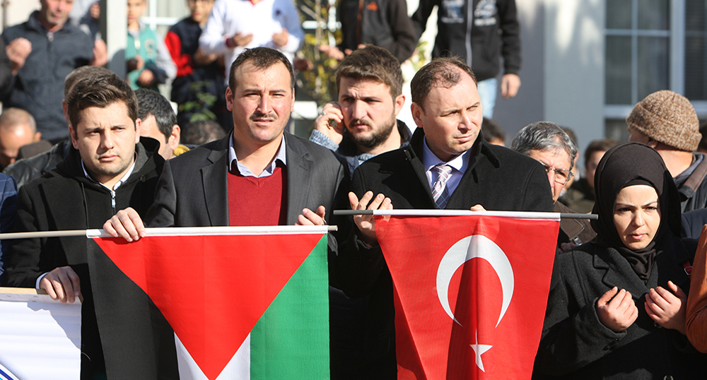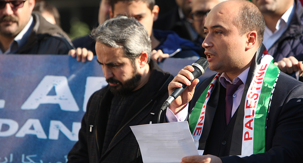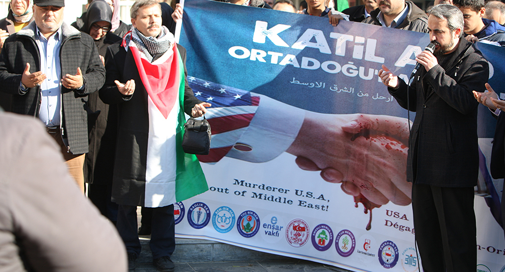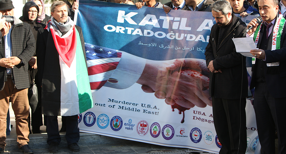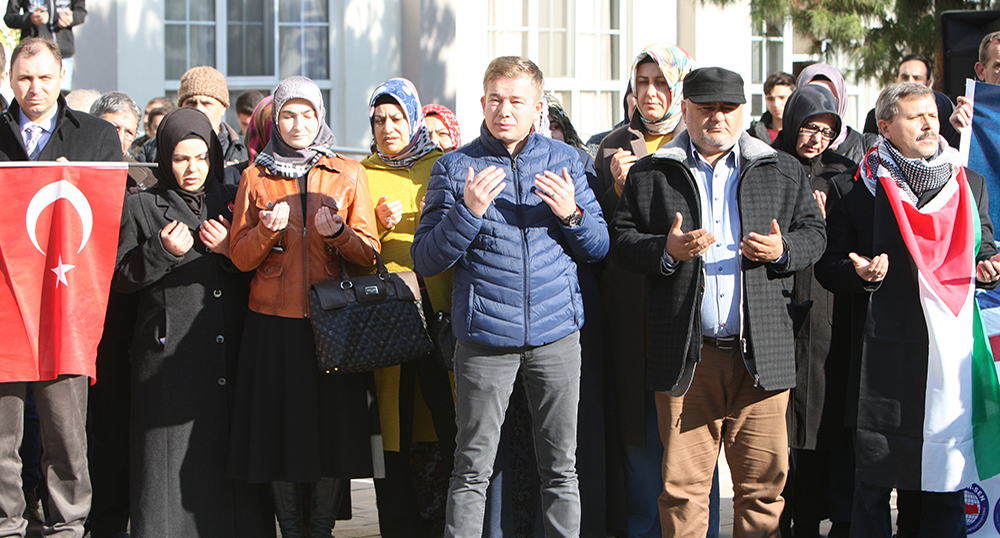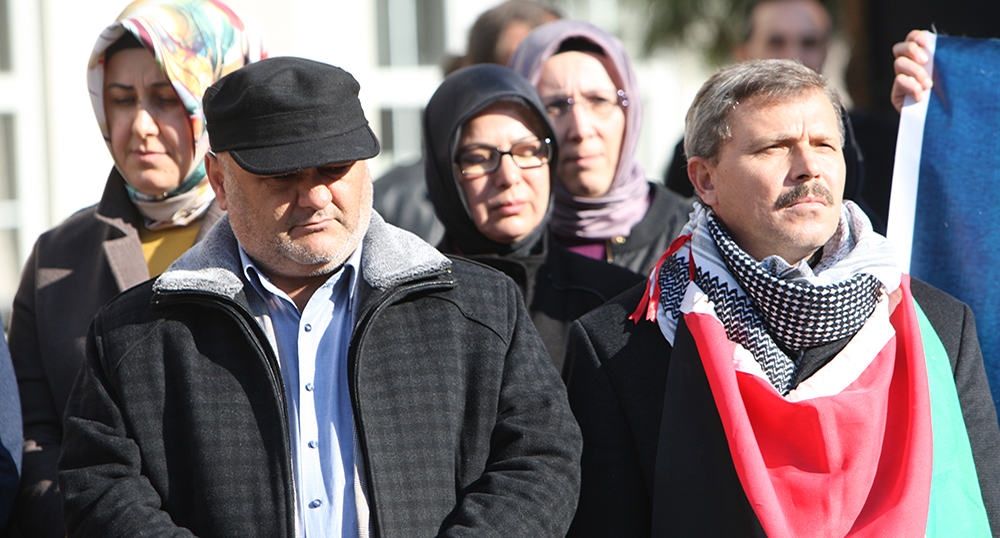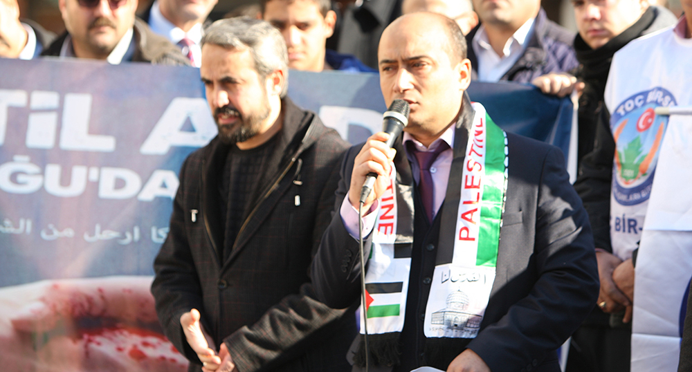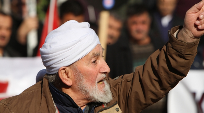 ABD’nin Kudus’ü İsrail’i başkenti olarak tanımasının ardından bugün Türkiye’nin bir çok yerinde protesto gösterileri gerçekleştiriliyor. Cuma namazı sonrası cami önlerinde toplanan vatandaşlar pankart ve sloganlarla ABD ve İsrail’i protesto ediyor.ABD Başkanı Donald Trump'ın Kudüs'ü İsrail'in başkenti olarak tanıyacağını açıklaması tüm yurtta olduğu Manisa’nın Turgutlu İlçesi’nde de Cuma Namazı sonrasında protesto edildi.TUSİDAP(Turgutlu Sivil Dayanışma Platformu) : Eğitim Bir Sen , İlim Yayma Cemiyeti, Ensar Vakfı, TUR-TİMDER, Turgutlu Din görevlileri Ve Din Gönüllüleri Derneği, İHH Turgutlu,Sağlık Sen, Bem Bir Sen, Büro Memur Sen, Toç Bir Sen, AKP Turgutlu ve SP Turgutlu İlçe Teşkilatınında kaılımların bulunduğu eylem bugün Pazar Camii’nde kılınan Cuma naması sonrasında cami karşında parkta toplanan grup pankart ve sloganlarla ABD ve İsrail’i protesto ettiPlatform adına basın açıklamasını okuyan Mehmet Taşçı “Amerika Birleşik Devletleri Başkanı Donald Trump’ın hukuksuz Kudüs açıklaması, insanlık vicdanını yaralamış ve bölgemizdeki sorunları derinleştirmiştir.” DediSP Turgutlu İlçe Başkanı ve AKP Turgutlu İlçe Başkanı Mürşit Gedizli’nin ardından konuşan Taşçı’nın konuşmasında bazı satır başları şu şekilde:Sayın Cumhurbaşkanımız’ın kesin şekilde ilan ettiği üzere Kudüs, tüm Müslümanların kırmızı çizgisidir.Bu, bölgemizde barışı ve istikrarı tehdit etmeye yönelik bir adımdır..İslam’ın sesini susturmak, kendi kurguları olan terör örgütlerini bahane ederek Müslümanların iradelerini esir etmek isteyenler, tarihte defalarca olduğu gibi yine hüsrana uğrayacaklardır.İslam’ın harem-i izzeti olan Kudüs’ü tacize teşebbüs edenler, Türküyle, Arabıyla, Kürdüyle tüm Müslümanlarda Selahaddin Eyyubi ruhunun dirilip karşılarına dikildiğini göreceklerdir.Türkiye’nin, İnsanlığın silüeti olan Kudüs’ün mahremiyetine yönelik bu saldırı karşısında Cumhurbaşkanımızın liderliğinde ortaya koyduğu güçlü tepkinin sonuna kadar arkasındayız.Dünyadaki tüm Müslümanların, İslam İşbirliği Teşkilatı Zirve Dönem Başkanı olan Türkiye’nin çağrısına kulak vererek Kudüs’e sahip çıkacağına inanıyoruz.Diğer taraftan, Amerika Birleşik Devletleri’nin bu kararı, dünyada yaşanan adaletsizliğin yeni bir tezahürüdür.Bu hadise, Cumhurbaşkanımızın, küresel sistemin çarpıklıklarına ve adaletsizliklerine karşı uzun zamandır dile getirdiği “dünya 5’ten büyüktür” itirazının haklılığını teyit etmiştir.İslam’ın kalbine saplanmaya çalışılan bu hançere, ancak tüm Müslümanların iki elin parmaklarının kenetlenmesi gibi bütünleşmesiyle engel olabiliriz.Biz müslümanlar olarak Kudüs davası ve ümmetin birliği için her türlü çabayı göstermeye, her türlü fedakarlıkta bulunmaya hazırız.Bütün grupları ve taraflarıyla bugüne kadar haklı, onurlu ve azimli muazzam bir mücadele ortaya koyan FİLİSTİN’ in yıllar boyunca en ağır şartlarda kesilmeyen mücadelesini selamlıyor ve şükranlarımızı sunuyoruz. Bundan sonra da maddi manevi yanlarında olduğumuzu buradan ilan ediyoruz.İslam Dünyası bütün Filistin topraklarına ve Filistin’in Başkenti Kudüs’e sahip çıkmalı siyasi, ekonomik, hukuki her türlü desteği sağlamalıdır.Kudüs Filistin’in başkentidir. Bütün Müslümanların kutsalıdır. Hiçbir zaman İsrail’in başkenti olmayacaktır.”Okunan dualardan sonra basın açıklaması olaysız şekilde sona erdi.Tuncel Yılmaz-Doğan ÇİZMECİ/TURGUTLUNOTLAR: *Olay yerinde polis sıkı önlem aldı *protestoya katılım yüksekdi. *Konuşma sık sık sloganlarla kesildi.* Yaşlı bir amcanın konuşması dakikalarca alkışlandı* Çevre binalarda oturanlarda basın açıklaması sonunda okunan duaya eşlik etti * Vatandaşlar pankart ve sloganlarla ABD ve İsrail’i protesto edildi.