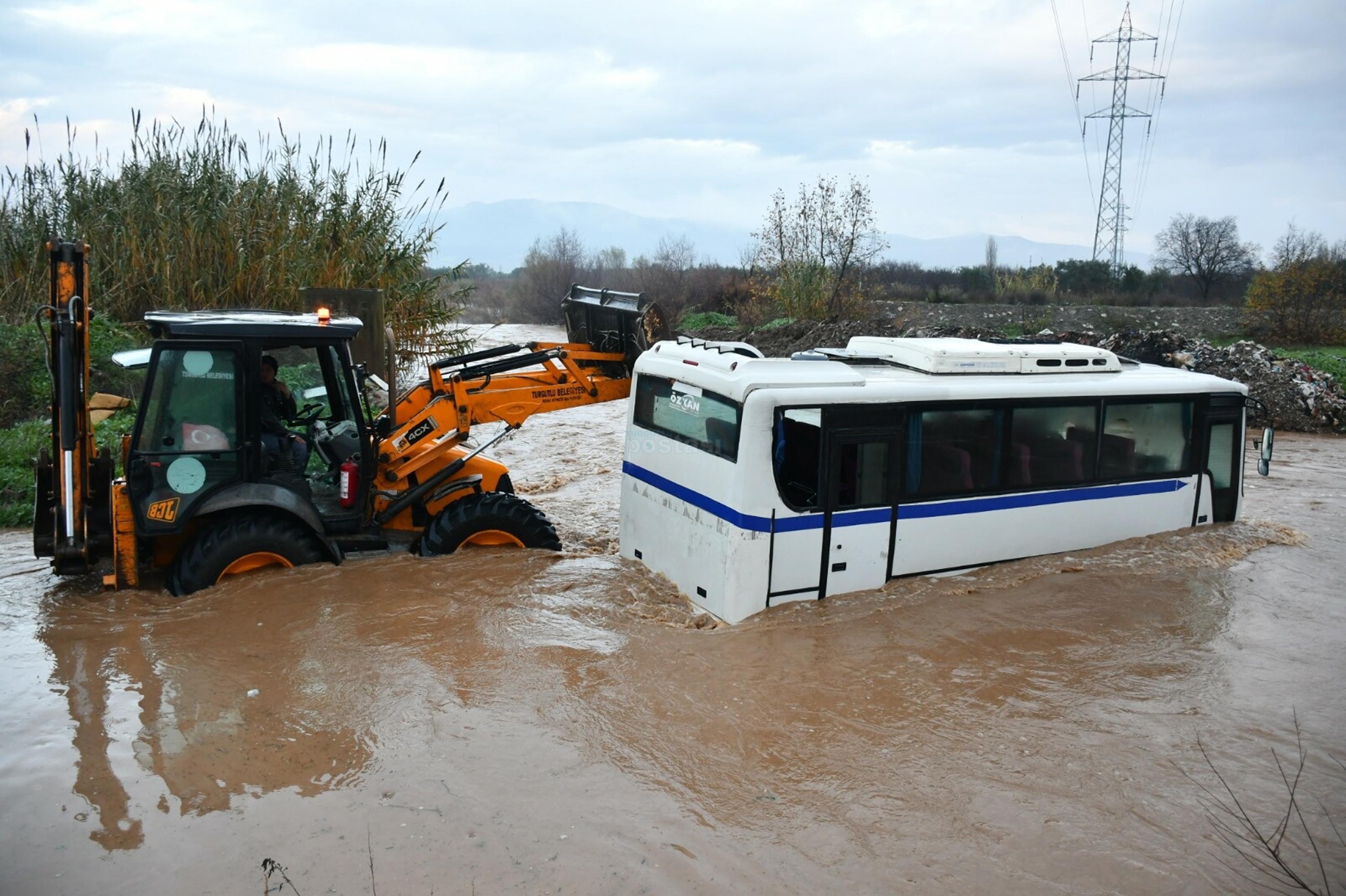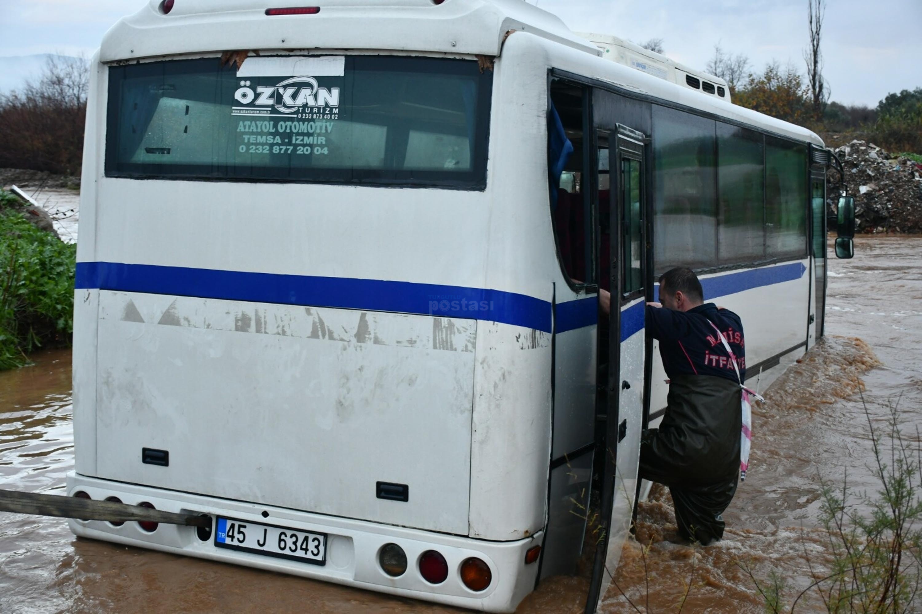 MANİSA'nın Turgutlu ilçesinde, bir konserve gıda fabrikasında çalışan işçileri taşıyan servis midibüsü sağanak nedeniyle debisi yükselen Karacaali Deresi yatağında mahsur kaldı. Midibüs şoförü ile 17 yolcu, traktör ve dozer kullanılarak kurtarıldı.