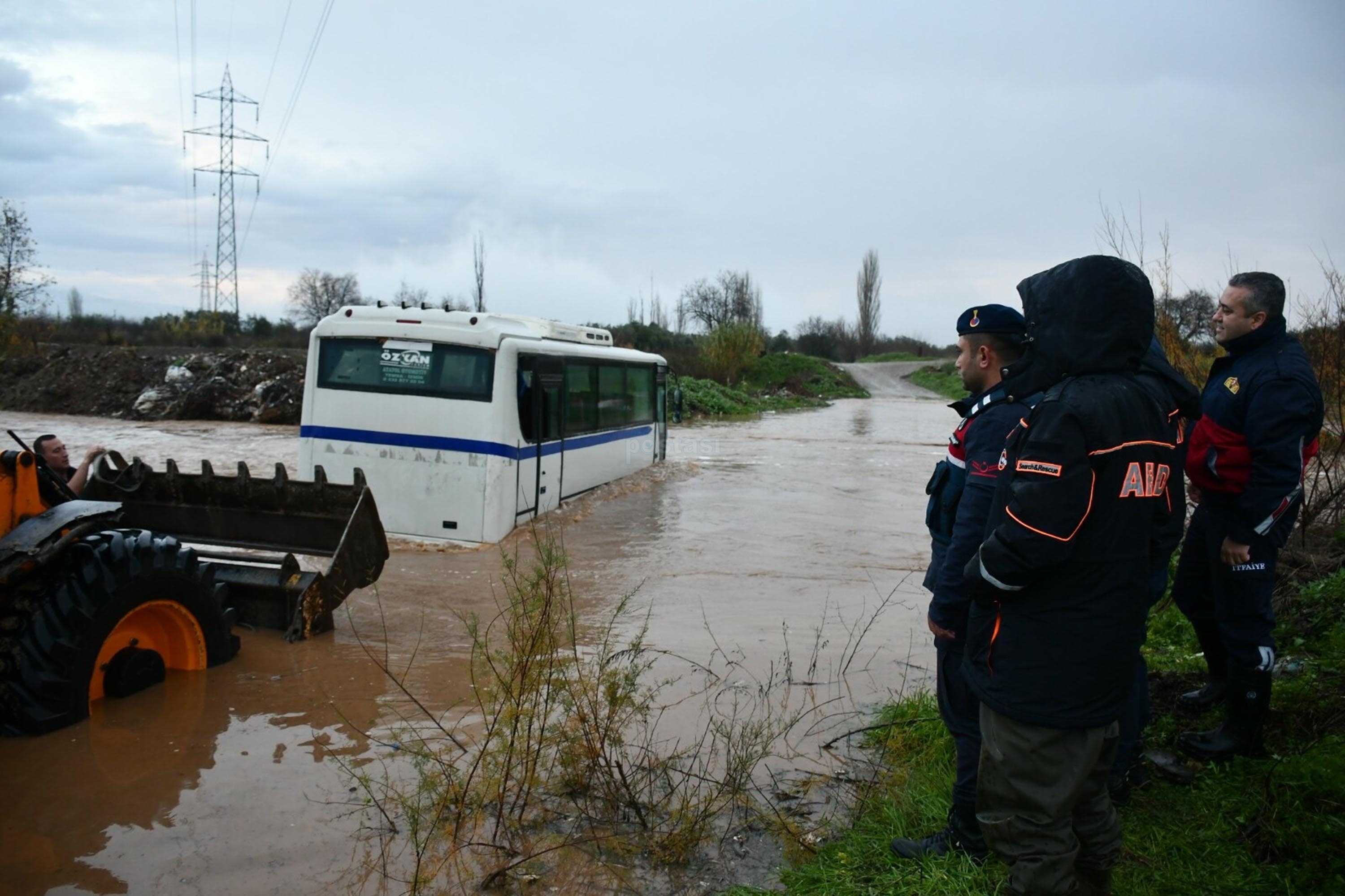 Turgutlu'da birkaç gündür etkili olan sağanak nedeniyle Derbent Mahallesi'nden geçen Karacaali Deresi'nin debisi yükseldi. Bir konserve gıda fabrikasına işçi taşıyan Recep Bilgiç (60), kullandığı 45 J 6343 plakalı servis midibüsüyle yolu kısaltmak için dere yatağından geçmek istedi. Bu sırada derenin dibindeki balçığa saplanıp, duran midibüs, suyla dolu derede mahsur kaldı. Çevredekilerin ihbarı üzerine olay yerine jandarma, itfaiye ve Manisa İl Afet ve Acil Durum Müdürlüğü (AFAD) ekipleri sevk edildi. Midibüs şoförü Bilgiç ve 17 yolcusu olay yerinden geçen bir traktör kullanılarak kurtarıldı. Midibüs ise bir dozerle bulunduğu yerden çekilerek, sudan çıkartıldı.