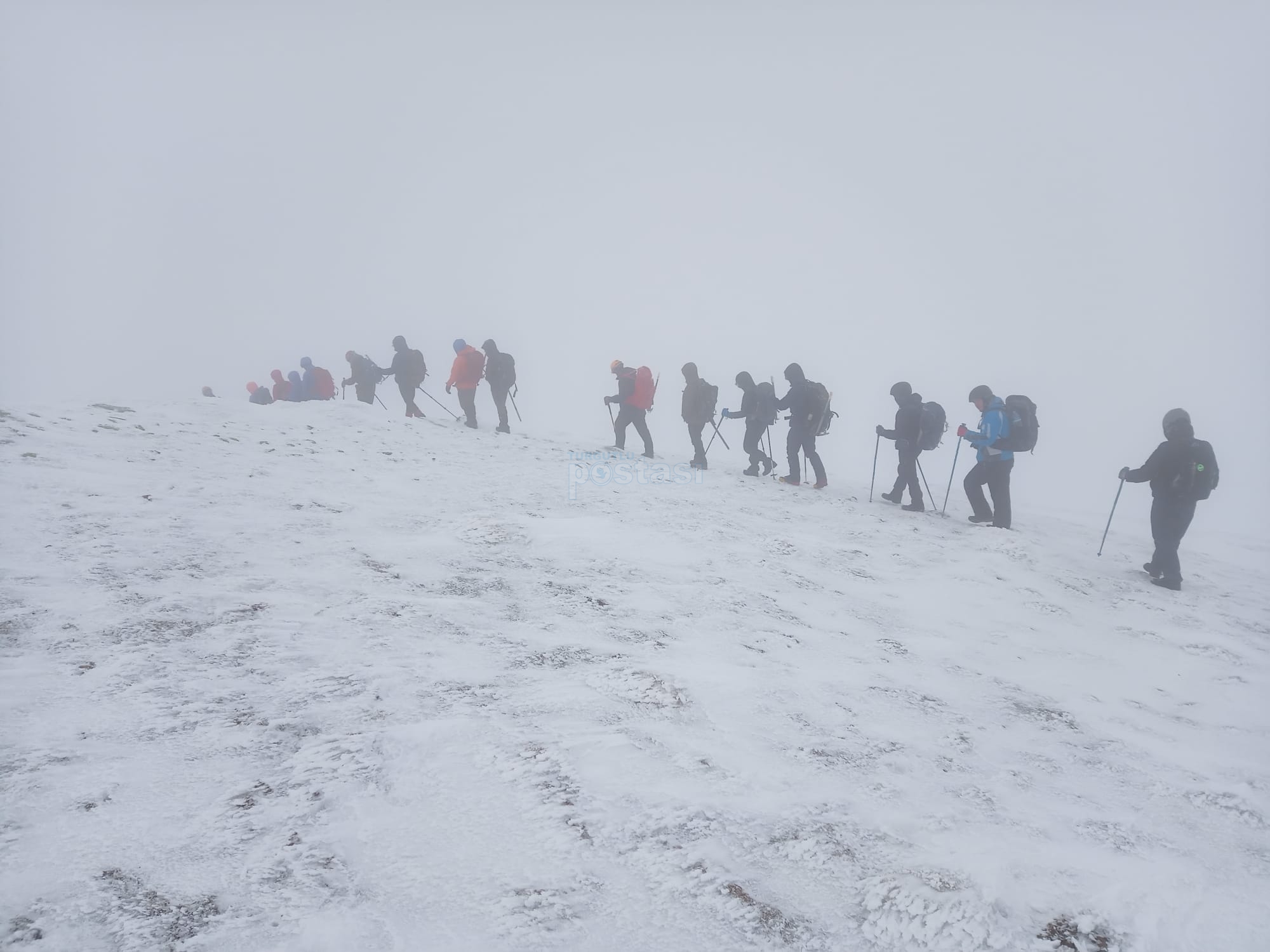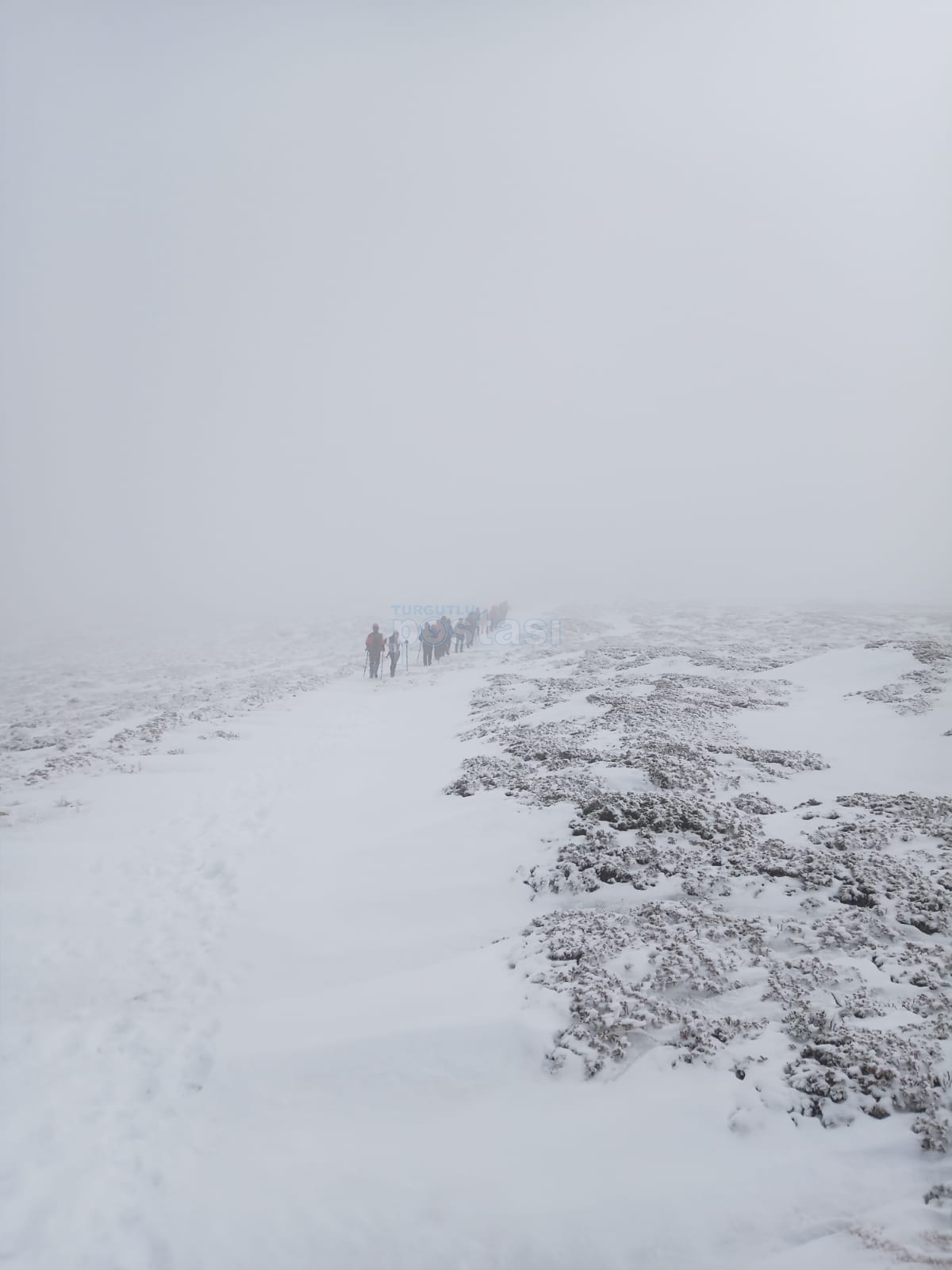 05.00’ te şiddetli rüzgarın sesiyle uyanıyorum. Sıcaklığın biraz daha düştüğü belli. Baktım uyku tutmuyor , yavaştan hazırlanmaya başlıyorum .Geceden hazırladığım zirve çantamı kontrol edip kahvaltı için çadırdan çıkıyorum. Oldukça soğuk bir sabaha merhaba diyerek kaskımı takıp ekip arkadaşlarıma katılıyorum. Otobüsümüze binerek tırmanışın başlayacağı 1600 rakımlı kayak merkezine hareket ediyoruz. Genel Başkanımız Orhan Kozan’ın ve rehberimiz Aygül Kaplanseren’in bilgilendirme konuşmalarının ardından yavaş yavaş yükselmeye başlıyoruz. Hava sisli ve rüzgarlı. Hepimizin düşüncesi öğlene doğru sisin dağılacağı ve rüzgarın azalacağı yönünde. Adım adım ilerliyoruz. Şiddetinin azalmasını beklediğimiz rüzgar hızlandıkça hızlanıyor. Rüzgara rağmen sisin de bu kadar yoğun olması şaşırtıcı. Kısa molalarla dinlenmeye ve su içmeye çalışıyoruz. Çalışıyoruz diyorum çünkü soğuktan ve rüzgardan kimse eldivenini çıkartıp çantasını sırtından indirmek istemiyor. İşte tam da böyle bir molada rehberimiz tarafından artçı olarak görevlendiriyorum. Benim için büyük onur. Böyle zor şartlarda artçılık yapmak biraz zor. Hem sis hem rüzgar bizi gittikçe yoruyor. Yardımlaşarak, yiyeceklerimizi paylaşarak rüzgara sırtımızı dönerek soluklanmaya çalışıyoruz. Tüm ekip zirve disiplininden kopmadan sırt hattına geliyoruz .Rehberimiz son kontrolleri yaparak moralimizi yükseltiyor. Yolun az kaldığını öğreniyoruz ama görüş mesafemiz çok düşük. Buna bir de saatteki hızı 50 km’ye varan rüzgar eklenince yürümek iyice zorlaşıyor. Rüzgarın da etkisiyle -4 derece olan ısının çok daha düşüğünü hissediyoruz. Saat 13.00 sonunda zirvedeyiz. Zirve direğinin altında birkaç fotoğraf anca çekebiliyoruz .İniş her zaman kolay olur denir ama biz yine de tedbiri elden bırakmıyoruz. Rehberimle daima irtibat halinde olup grubumuzun durumunu takip ederek kendisini bilgilendiriyorum .Son ana kadar kopmadan, dağılmadan yürüyüşümüzü sağlıkla ,başarıyla saat 16:30 da tamamlıyoruz. Hepimiz adeta dayak yemiş gibiyiz. Kayak merkezi tesisinde soba başında ısınıp çay içerek kendimize geliyoruz. İşin zor bir kısmı daha var. Çadır toplama...