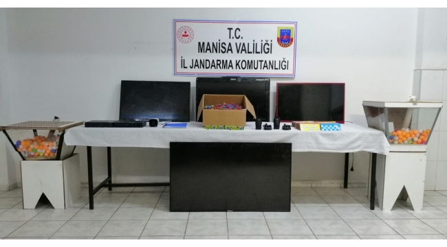 Manisa’nın Turgutlu İlçesi Derbent Mahallesinde tombala oynatılan bir dernekte yapılan aramada (2) Tombala Makinesi,(632) Tombala topu,(753) Tombala Kağıdı,(15414)Çay Pulu,(4) Televizyon,(2) Kamera Kayıt Cihazı ,(1) Kamera,(2) El Telsizi ele geçirildi.