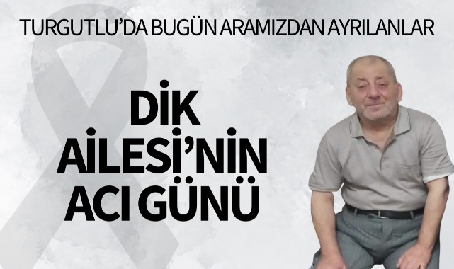 Dik Ailesi’nin Acı GünüTURGUTLU İlçesi sakinlerinden Irlamazlı Mehmet Dik’in oğlu Hasan Dik 67 yaşında hakkın rahmetine kavuştu.Cenazesi bugün öğle namazına müteakip Demirci Camii’nde kılınacak cenaze namazının ardından yeni kabristanda toprağa verilecek.Yakınları: merhum Hüseyin Dik, merhum Saime Yercan, Sevgi Akyol, oğulları Murat Dik, Fatih Dik, kızı Zeynep Dik Merhuma Allah'tan rahmet, yakınlarına başsağlığı dileriz.