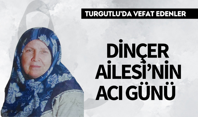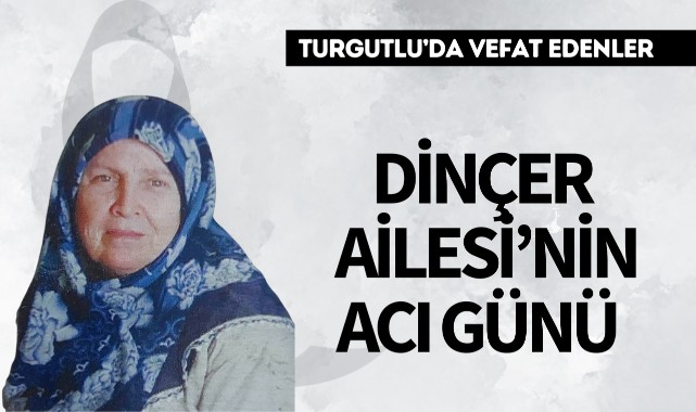 Dinçer Ailesi’nin Acı GünüTURGUTLU İlçesi sakinlerinden Tevfik Dinçerin eşi Esma Dinçer hakkın rahmetine kavuştu. Cenazesi bugün Orta Camii'nde kılınacak ikindi namazına müteakip cenaze namazının ardından Urganlı Kabristanında toprağa verilecek.Yakınları: Kızları Huriye Selmanoğlu, Ayten Pehlivan , Oğulları: Celalettin Dinçer ,Önder DinçerMerhumeye Allah'tan rahmet, yakınlarına başsağlığı dileriz.