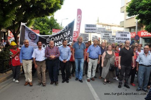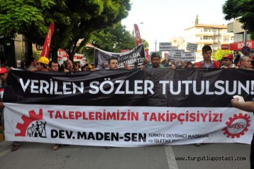 DİSK'TEN SOMALI MADENCİLERE DESTEK YÜRÜYÜŞÜ MANİSA'nın Soma İlçesi'nde, Türkiye Devrimci İşçi Sendikaları Konfederasyonu (DİSK) öncülüğünde 'Madenciye verilen sözler tutulsun, Soma'nın yaraları sarılsın' yürüyüşü düzenlendi. Mayıs ayında 301 madencinin ölümüyle sonuçlanan maden faciasının yaşandığı Soma'da, Dev-Maden-Sen Genel Başkanı Tayfun Görgün, Dev Maden Sen Yönetim Kurulu, DİSK Genel Başkanı Kani Beko, DİSK eski Genel Başkanı İzmir Milletvekili Süleyman Çelebi, CHP Manisa Milletvekili Özgür Özel, Sanatçı Tarık Akan ve Maden işçilerinin katılımı ile yaklaşık 200 kişi Beşyol Mevkii'nde saygı duruşu ve İstiklal Marşı'nın ardından sloganlar eşliğinde Cengiz Topel Meydanı'nda toplandı. Grup adına bir açıklama yapan Dev-Maden-Sen Genel Başkanı Tayfun Görgün, "Bugün burada bir kez daha Soma işçisinin yalnız ve sahipsiz olmadığını herkes görmektedir. Burada maden işçisinin özgür iradesi ve birleşik gücü var. Burada şehitlerimizin anısı ve onların hesabını soracak irade var. Burada DİSK var, Dev-Maden- Sen var. Hiç kimse ama hiç kimse 301 kardeşimizin yaşamını yitirdiği katliamı unutturamayacaktır. Unutturulmalarına asla izin vermeyeceğiz. Katliamın hemen ardından hakkımız olan ve bize verilen sözleri de unutturamayacaklardır" dedi. Torba yasanın çorba yasaya döndüğünü söyleyen DİSK Genel Başkanı Kani Beko, "15-16 madde bir günde çok rahat bir şekilde çıkabilirdi. Neden? İlk yasasını hatırlarsanız bir gecede çıktı. 135 maddeye kadar genişletilen bu yasa, sonradan rant yasasına döndü. Ben buradan DİSK Genel Başkanı olarak size söz veriyorum. Dev-Maden-Sen'in başkanlığında madenci arkadaşlarımızla 28 Ağustos'ta eğer gündeme gelmezse maden yasası mecliste grubu bulunan önce siyasi partileri ziyaret edeceğiz, ondan sonra Meclis Başkanının, Başbakanın ve Cumhurbaşkanının elimiz iki yakasında olacak. 301 arkadaşımızı burada kaybettik. Önümüzdeki dönemde 301 arkadaşımızı da kaybetmek istemiyorsak yapılacak tek şey Soma'da taşeronlara Soma madenler teslim edilmemeli. Geçmişte olduğu gibi Soma ve Türkiye'deki tüm madenler TKİ'ye teslim edilmeli" dedi.EMEKTEN YANA BİR SENDİKA VARDIR, O DA "DİSK CHP Manisa Milletvekili Özgür Özel, "Madenlerdeki haklarımız bilmek, madenlerde direnerek, mücadele ederek, elbette alın teri dökerek hakkımızı almayı bilmek, ancak bir sendikal bilinçten ve patrondan değil, emekten yana bir sendikadan geçer. Bunun adı Türkiye'de DİSK'tir. Devrimci İşçi Sendikaları'dır. Şu anda Türkiye'deki durum şudur; Soma A.Ş. bir maden şirketi değil de bir hava yolu şirketi olsaydı, Başbakan Tayyip Erdoğan'a soruyorum; 13 Mayıs günü Soma A.Ş.'ye ait bir uçak havalandı. 301 yolcusu ile yola çakıldı, hepsi öldü. Şimdi aynı marka, aynı model, aynı eğitimde personelle bir benzer uçağı tekrar kaldırmak istiyor Soma A.Ş. Ey Tayyip Erdoğan, Bilal oğlanı, Sümeyye'yi, o balkonda yanına dizdiğin o yandaşlarını, arkadaşlarını, evlatlarını o uçağa bindirir misin? Emin olun bindirmez" dedi. DİSK NEREDEYSE BEN ORADAYIM DİSK neredeyse kendisinin de orada olduğunu belirten sanatçı Tarık Akan, "Bana göre Soma'da DİSK gibi bir sendika daha önceden olmuş olsaydı bu facialar yaşanmazdı. Açık ve net" dedi. Açıklamaların ardından grup olaysız bir şekilde dağıldı.DHA