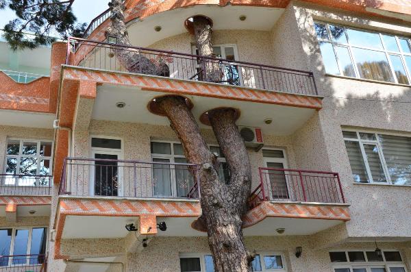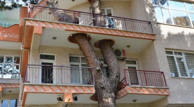 MANİSA'da 325 yıllık kızılçam ağacı 4 katlı binanın içinden geçiyor. 2004 yılında yapılan bina, yıllardır ağaçla birlikte ayakta duruyor.