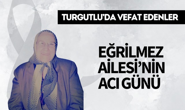 Eğrilmez Ailesi’nin Acı GünüTURGUTLU İlçesi sakinlerinden Hatice Eğrilmez hakkın rahmetine kavuştu. Cenazesi bugün öğle namazına müteakip Dereköy Camii’nde kılınacak cenaze namazının ardından eski kabristanda toprağa verilecek.Yakınları: oğlu Rıza Eğrilmez, kızları Hüsniye Özerginer, Raşide ErentürkMerhumeye Allah'tan rahmet, yakınlarına başsağlığı dileriz.