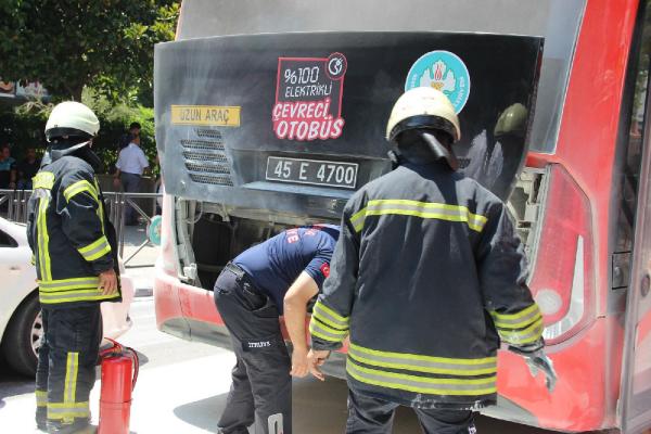 Elektrikli otobüsten çıkan duman korkuttu MANİSA'da elektrikli belediye otobüsünün motor kısmından yükselen duman korku yarattı. Yangın tüpüyle müdahale edilen olayda, dumanın kompresörden geldiği anlaşıldı.Olay, saat 14.00 sıralarında meydana geldi. Şehir Hastanesi-Uncubozköy hattında çalışan 45 E 4700 plakalı elektrikli belediye otobüsü, Şehzadeler ilçesi 15 Temmuz Demokrasi Meydanı'na geldiğinde, otobüsün motor bölümünden dumanlar yükselmeye başladı. Bunun üzerine şoför A.E. (40) otobüsü sağa çekip, durdu. Dumanların yükseldiği kısma yangın tüpleriyle müdahale edildi. Bu sırada paniğe kapılan yolcuların ihbarı üzerine olay yerine itfaiye ekipleri sevk edildi. Ekiplerin yaptığı incelemede, dumanların otobüsün kompresöründen çıktığı, herhangi bir yangının söz konusu olmadığı belirlenince, herkes rahat bir nefes aldı.DHA