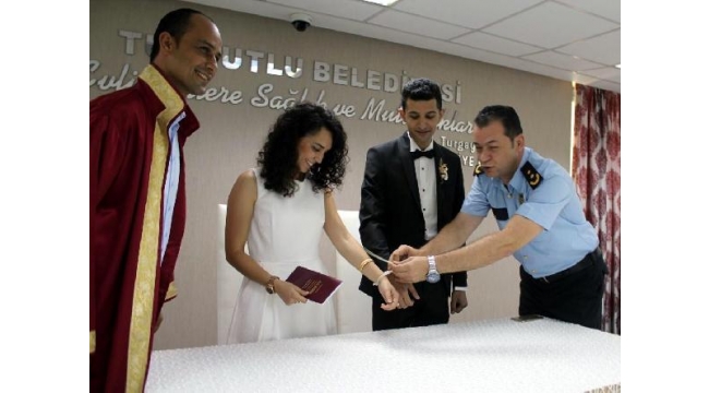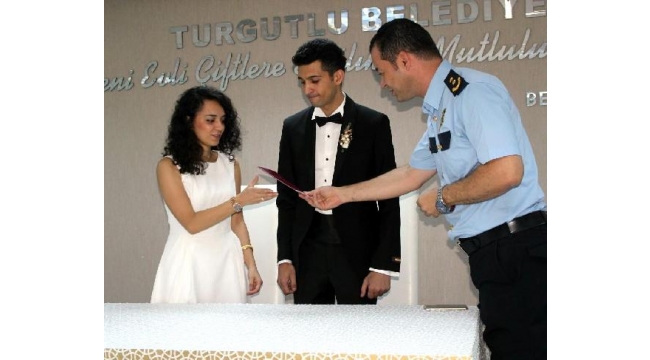 Emniyet müdürü, polis damat ve geline plastik kelepçe taktıMANİSA'da, Turgutlu İlçesi Emniyet Müdürü Volkan Parıldar, polis memuru Yasin Göktaş'ın nikahında şahitlik yaptı. Müdür Parıldar, bileklerine sembolik plastik kelepçe taktığı çiftin ömür boyu ayrılmamaları dileğinde bulundu.Turgutlu İlçe Emniyet Müdürlüğü'nde 2017'nin Aralık ayından beri görev yapan polis memuru Yasin Göktaş (26), öğretmen Simge Kahraman'la (25) hayatını birleştirdi. Genç çift için Turgutlu Belediyesi Nikah Dairesi'nde nikah töreni gerçekleştirildi. Nikah törenine çiftin ailesi ve yakınlarının yanı sıra Turgutlu İlçe Emniyet Müdürü Volkan Parıldar da katıldı. Törende mutluluğa 'evet' diyen çiftin nikah şahitliğini de yapan Parıldar, evlilik cüzdanını geline takdim etti. Ayrıca çiftin bileklerini plastik kelepçeyle bağlayan Müdür Parıldar; Yasin Göktaş ve Simge Kahraman'ın ömür boyu ayrılmamaları temennisinde bulundu.