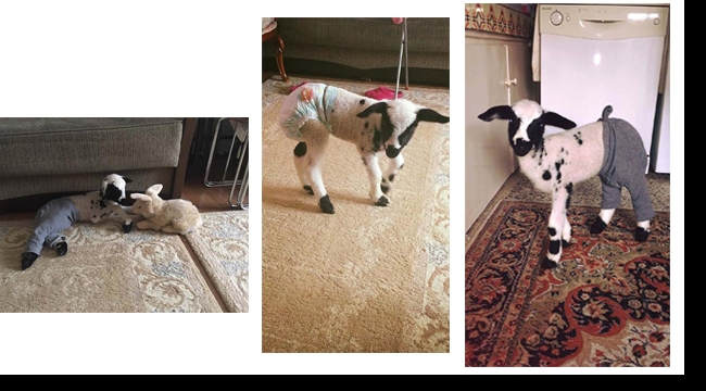 Eve aldıkları kuzuyu biberonla besleyip, altına bez bağlıyorlar