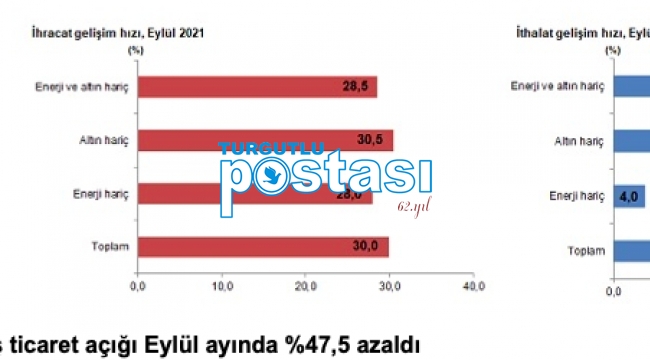 Eylül ayında dış ticaret açığı bir önceki yılın aynı ayına göre %47,5 azalarak 4 milyar 856 milyon dolardan, 2 milyar 547 milyon dolara geriledi. İhracatın ithalatı karşılama oranı 2020 Eylül ayında %76,7 iken, 2021 Eylül ayında %89,1'e yükseldi.