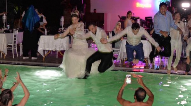 Gelin almaya mehter takımı eşliğinde gittiMANİSA'da işadamı 26 yaşındaki Can Yüce, yaşamını birleştirme kararı aldığı 24 yaşındaki Burcu Ergüzel'i almaya mehter takımı eşliğinde gitti. Çiftin düğünü aşırı sıcak nedeniyle havuzda sona erdi.Sümer Yüce ve Vesile Yüce çiftinin oğlu işadamı Can Yüce gönlünü kaptırdığı, merhum Ali Hikmet Ergüzel ve Ayşe Ergüzel çiftinin kızları Burcu Ergüzel ile yaşamlarını düğün ile birleştirdi. Gelin evine motosiklet grubu ve mehter takımı eşliğinde giden damat Yüce, nikah töreni öncesi semazen gösterisi hazırladı. Nikah ardından müzik eşliğinde eğlenen çift ve davetliler, düğünde sıcaktan bunalınca havuza atladı. Orkestra üyelerini de havuza atan damadın arkadaşları, ortaya ilginç görüntülerin çıkmasına sebep oldu.HAVUZDA TEKLİF ETTİGecenin bir diğer sürprizini damadın arkadaşlarından Ahmet Çokal yaptı. Kız arkadaşı Sevil Yılmaz'a havuza atlayarak evlenme teklifi eden Çokal, 'Evet' yanıtını alınca, eğlence kaldığı yerden devam etti. Damat Can Yüce, "Düğün günümüzün eğlenceli geçmesini bekliyorduk ama sıcak ve havuzu hesaba katmamıştık. Bu olay bize de sürpriz oldu. Bizler de eğlendik düğüne gelen havuza atlayan arkadaşlarım da eğlendi. Düğün günü yaşananlar bizler için büyük bir anı, eşimi seviyorum" dedi. DHA