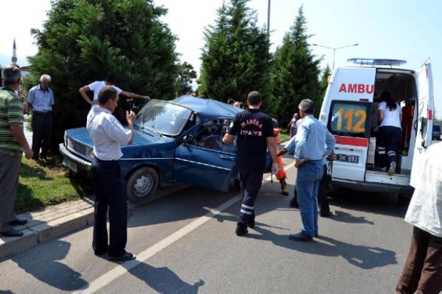 MANİSA'nin Salihli'de İlçesi'nde, direksiyon hakimiyetini kaybeden otomobil önündeki TIR'a çarptıktan sonra refüjü aşarak ağaça vurarak durabildi.