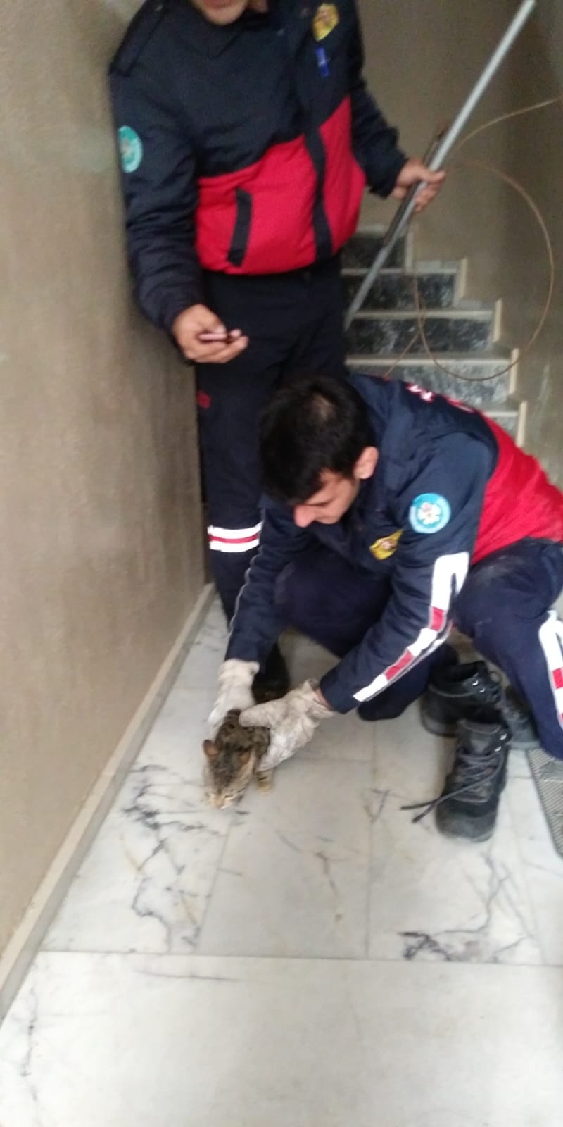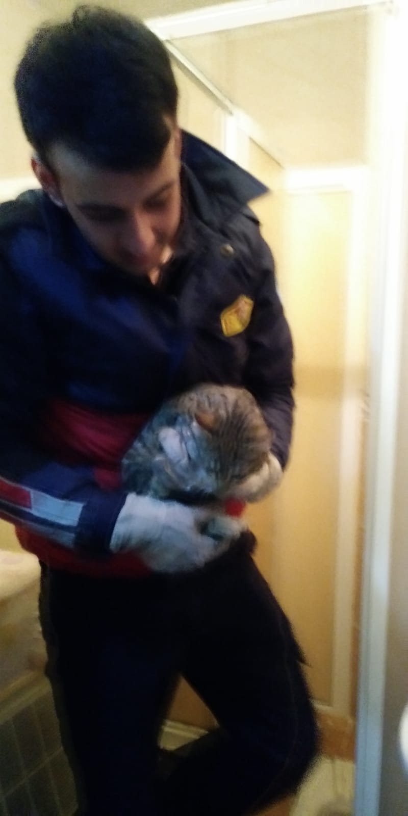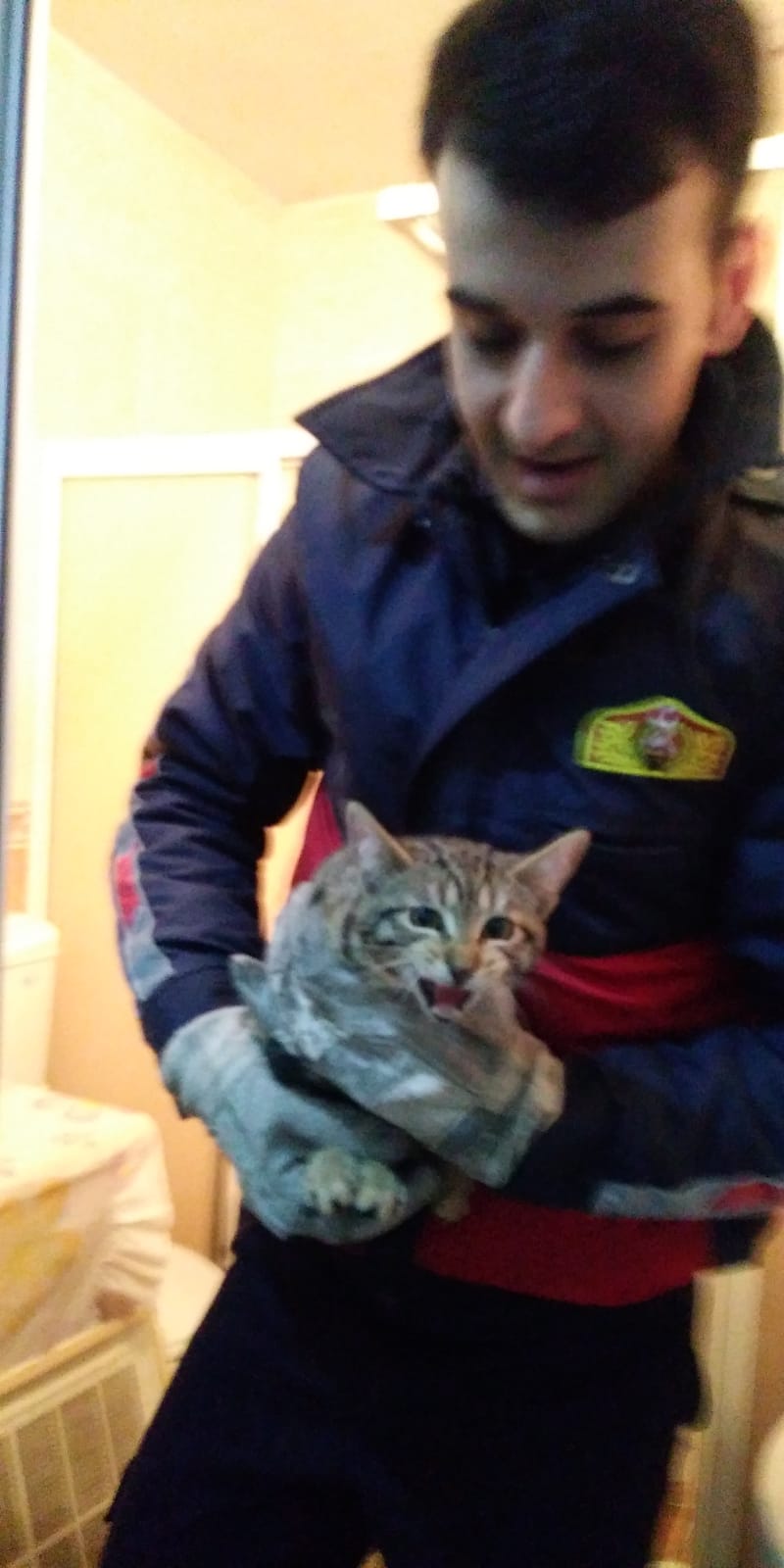 Kurtuluş Mahallesi Şehitler Yolu 101 numaradaki 5 katlı apartmanın çatısından, yaklaşık 15 metre yükseklikten havalandırma boşluğuna düşen yavru kedinin sesini duyanlar, itfaiyeden yardım istedi. Olay yerine gelen itfaiye ekibi, zemin katta oturan Halil Şen’in evinin tuvalet penceresinden, özel bir aparatla kediyi kurtardı. Ev sahibi Şen , sağlık durumu iyi olan kediyi 4 katta oturan Nurdane Karacaova ‘ya olduğunu belirtti.Apartman sakinleri itfaiye görevlilerine teşekkür etti. İtfaiye görevlisi ,kediyi Bayan Karacaova, teslim etti. Karacaova “ Kedimiz bir gündür yoktu. Bir yerlerden ses geliyordu ama aşağı düştüğünü düşünmemiştik. “Dedi.Erkan Şimşek