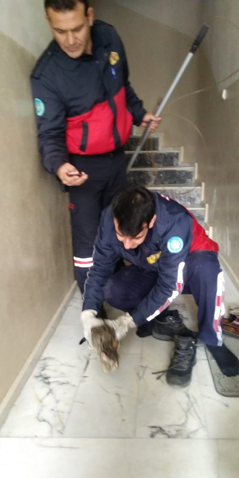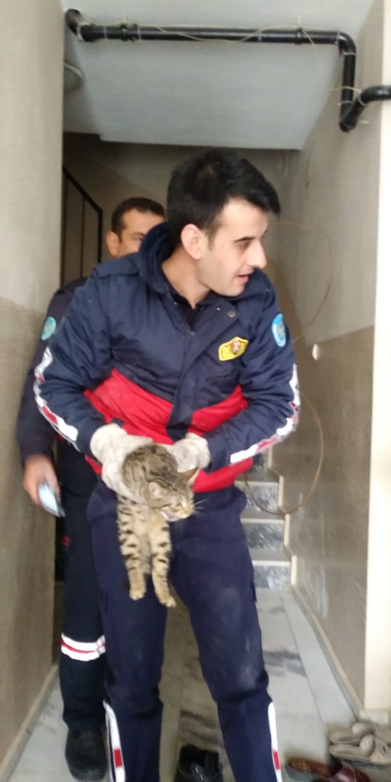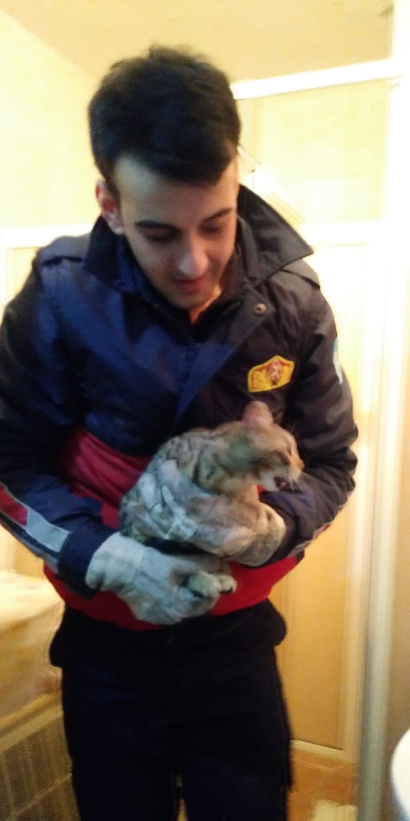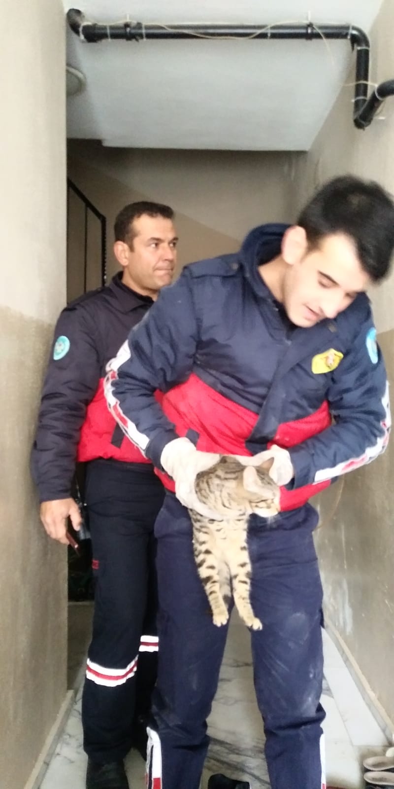 Kurtuluş Mahallesi Şehitler Yolu 101 numaradaki 5 katlı apartmanın çatısından, yaklaşık 15 metre yükseklikten havalandırma boşluğuna düşen yavru kedinin sesini duyanlar, itfaiyeden yardım istedi. Olay yerine gelen itfaiye ekibi, zemin katta oturan Halil Şen’in evinin tuvalet penceresinden, özel bir aparatla kediyi kurtardı. Ev sahibi Şen , sağlık durumu iyi olan kediyi 4 katta oturan Nurdane Karacaova ‘ya olduğunu belirtti.Apartman sakinleri itfaiye görevlilerine teşekkür etti. İtfaiye görevlisi ,kediyi Bayan Karacaova, teslim etti. Karacaova “ Kedimiz bir gündür yoktu. Bir yerlerden ses geliyordu ama aşağı düştüğünü düşünmemiştik. “Dedi.Erkan Şimşek