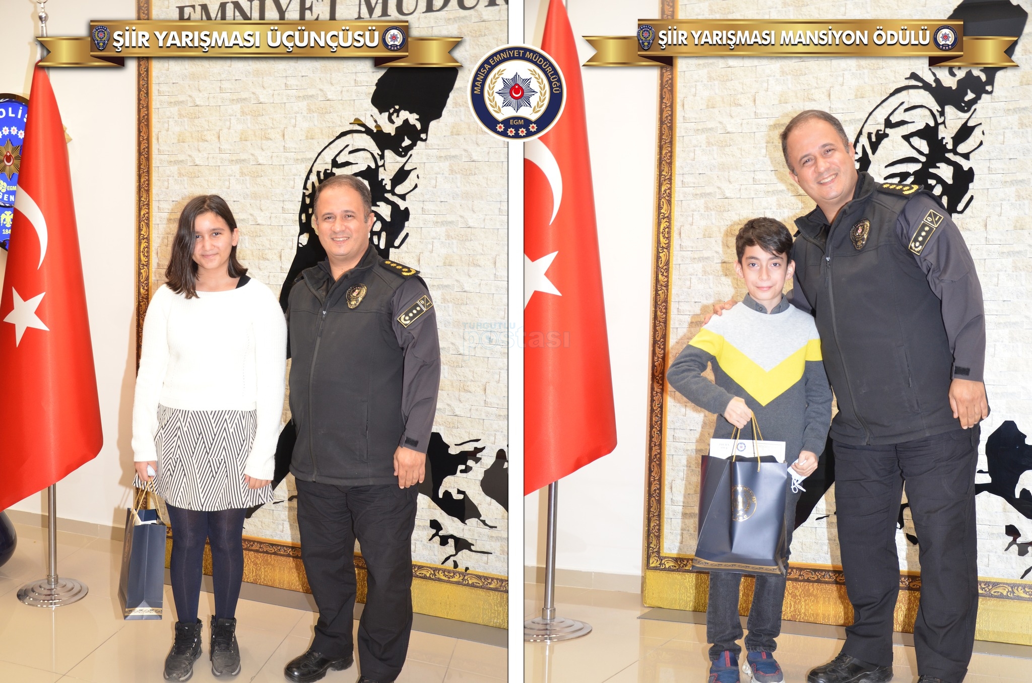 Toplum Destekli Şube Müdürlüğü tarafından Manisa merkezinde eğitim gören İlkokul (Resim) ve Ortaokul (Şiir) düzeyindeki öğrencilere yönelik düzenlenen ve dereceye giren öğrencilere çeşitli hediyelerin verildiği resim ve şiir yarışmasının ödül töreni, İl Emniyet Müdürlüğünde dereceye giren öğrencilerin, aileleri ve okul yetkililerinin katılımlarıyla gerçekleştirildi.