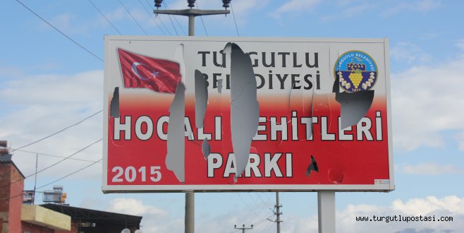 TURGUTLU Belediyesi’nin meclis kararıyla ‘Hocalı Şehitleri Parkı’ adını vererek hizmete açtığı parkın tabelası kimliği belirsiz kişi veya kişilerin saldırısına uğradı.