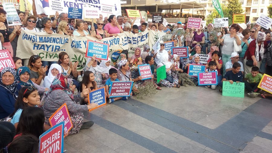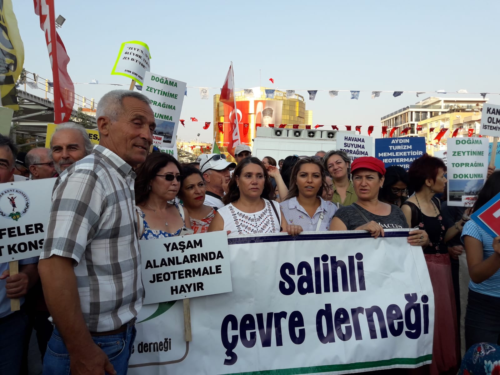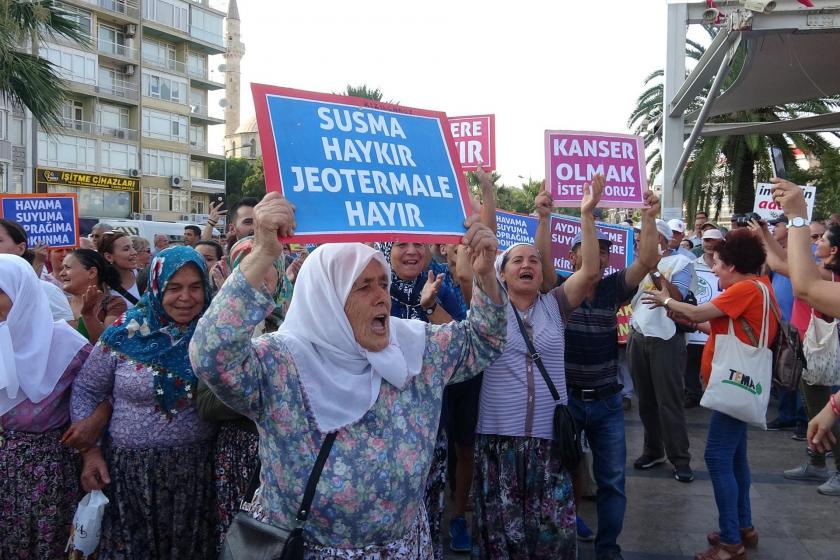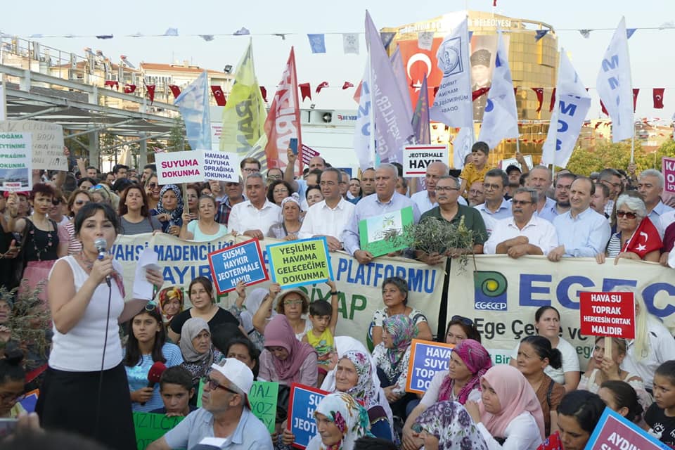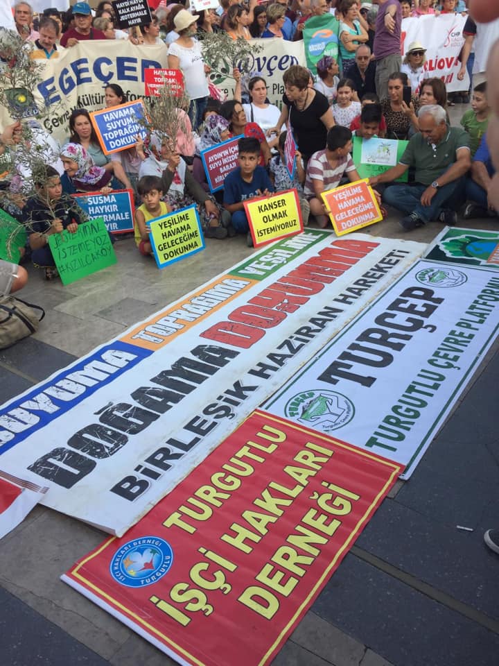 Hukuksuz JES ihalelerine karşı basın açıklaması için TURÇEP de Aydın’a destek verdiAydın’da, 110 jeotermal saha çalışması için yapılacak olan ihale öncesi yaklaşık 1500 dolayında kişinin katılımıyla miting havasında geçen bir basın açıklaması yapıldı. 5-8 Ağustos tarihleri arasında yapılacak ihale öncesi, yaşam savunucuları dün akşam saatlerindesaat19.00’da aydın kent merkezindeki alanda miting havasında geçen basın açıklaması yaptı. Aydın Çevre ve Kültür Platformu (AYÇEP), Efeler Belediyesi ve Aydın Tabip Odası tarafından ortaklaşa düzenlenen basın açıklamasına Aydın ve ilçelerinin yanı sıra, Manisa’dan Turgutlu ve Salihli, Denizli ve İzmir’den de gelen çok sayıda kişi katıldı. TURÇEP (Turgutlu Çevre Platformu) olarak düzenlenen organizasyonla başta TURÇEP dönem sözcüleri Nacittin Durak ve Meral Ünal Türkmen olmak üzere bazı yürütme kurulu üyeleri yanı sıra, bileşenlerden YAŞAMDER ve İşçi Hakları Derneği’ndan başka ayrıca Salihli Çevre Derneği’ndan da katılımlarla 20 kişilik bir ekiple Aydın’daki JESlere karşı yapılan basın açıklamasına katılım sağlandı. Atatürk Kent Meydanı’ndaki eylemde, CHP Aydın milletvekilleri Bülent Tezcan, Süleyman Bülbül, Hüseyin Yıldız, Efeler Belediye Başkanı CHP’li Mehmet Fatih Atay, Tabip Odası Başkanı Dr. Hakan Karagözlü ve STK temsilcileri de yar aldı. Ellerinde döviz ve zeytin dalları ile alana gelen kadınlar, “Havamıza suyumuza dokunma”, “Kanser olmak istemiyoruz” sloganları attı. Çocukların da aralarında bulunduğu kadınlardan oluşan bir grup ise yere oturarak eylem yaptı.Mücadelemizde hep yerde ve hep beraberizMiting havasında geçen basın açıklamasında AYÇEP Başkanı Mehmet Vergili yaptığı konuşmada, “Şu anda Aydın’dan, Manisa Turgutlu’dan TURÇEP aramızda, Salihli’den, İzmir ve Denizli’den olmak üzere birçok il ve ilçeden yürekli insanlar buraya gelmiş. Havasını, suyunu ve toprağını kurtarmak için gelmiş. Bizim topraklarımız birinci sınıf tarım toprağı ve bizlerde birinci sınıf insanlarız. Jeotermalle mücadele için bundan sonra hep beraberiz. Mücadelemizde heryerde ve hep beraber kolkola dayanışma içinde olacağız” dedi.Başkan Çetin Akın’a teşekkürSaat 1600’da Aydın’a bir ataçla hareket eden Turgutlulu heyet, gece ise 23.00 sularında ilçeye döndü. Bu arada TURÇEP dönem sözcülerinden Nacettin Durak, Turgutu’ya “Aydın’da yapılan bu basın açıklaması çok önemliydi ve bizleri de yakından ilgilendiriyor. Çünkü bu JESler için verilen izinler ve yapılan ihaleler tamamen hukuka aykırı olarak gerçekleşiyor. Bu bakımdan bizlerinde bu basın açıklamasına kartı ve destek için gitmemiz çok anlamlıydı. Bu nedenle de Turgutlu Belediye Başkanı Çetin Akın’a bu basın açıklamasına katılabilmemiz için bizlere araç temini konusundaki yardımları ve gösterdiği duyarlılık için teşekkür ediyoruz” dedi.