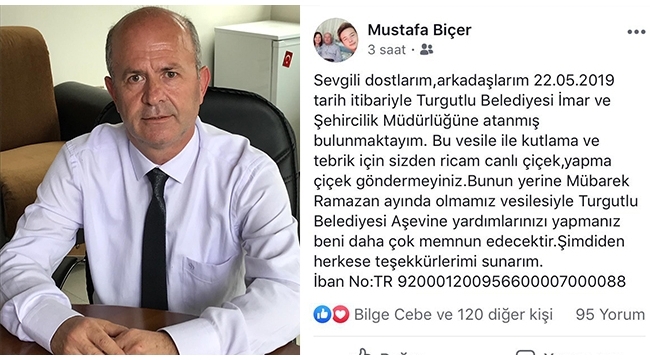 TURGUTLU Belediyesinde 27 yıldır görev yapan Mustafa Biçer, Turgutlu Belediyesi İmar ve Şehircilik Müdürlüğü’ne atanarak bugün yeni görevine başladı.Turgutlu Belediyesi’nde 1992 yılından bu yana çeşitli birimlerde görev alan Mustafa Biçer, 22 Mayıs 2019 tarihi itibariyle İmar ve Şehircilik Müdürlüğüne atandı. Biçer, kendisine kutlama ve tebrik için vatandaşların çiçek göndermemelerini, Turgutlulular’ın alan elle veren el arasında köprü olmaya devam eden Turgutlu Belediyesi Aşevi ve Hayır Merkezine bağışta bulunmalarını istedi.İmar ve Şehircilik Müdürü Mustafa Biçer, sosyal medya hesabından yaptığı açıklamasında: “22.05.2019 tarihi itibariyle Turgutlu Belediyesi İmar ve Şehircilik Müdürlüğüne atanmış bulunmaktayım. Bu vesile ile kutlama ve tebrik için sizden ricam canlı çiçek ve yapma çiçek göndermeyiniz. Bunun yerine mübarek ramazan ayında olmamız vesilesiyle Turgutlu Belediyesi Aşevine yardımlarınızı yapmanız beni daha çok memnun edecektir. Şimdiden herkese teşekkürlerimi sunarım.” dedi.Biçer, vatandaşların İban No: TR 920001200956600007000088 hesabına bağışta bulunabileceklerini belirtti. Nurullah ÇANKAYA