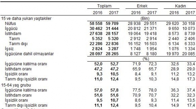 İşgücü 2017 yılı Nisan döneminde bir önceki yılın aynı dönemine göre 982 bin kişi artarak 31 milyon 444 bin kişi, işgücüne katılma oranı ise 0,7 puan artarak %52,7 olarak gerçekleşti. Aynı dönemler için yapılan kıyaslamalara göre; erkeklerde işgücüne katılma oranı 0,4 puanlık artışla %72,3, kadınlarda ise 0,8 puanlık artışla %33,4 olarak gerçekleşti.