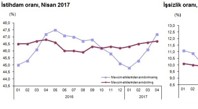 Türkiye genelinde 15 ve daha yukarı yaştakilerde işsiz sayısı 2017 yılı Nisan döneminde geçen yılın aynı dönemine göre 463 bin kişi artarak 3 milyon 287 bin kişi oldu. İşsizlik oranı ise 1,2 puanlık artış ile %10,5 seviyesinde gerçekleşti. Aynı dönemde; tarım dışı işsizlik oranı 1,4 puanlık artış ile %12,4 olarak tahmin edildi. Genç nüfusta (15-24 yaş) işsizlik oranı 3,8 puanlık artış ile %19,8 olurken,15-64 yaş grubunda bu oran 1,2 puanlık artış ile %10,7 olarak gerçekleşti.